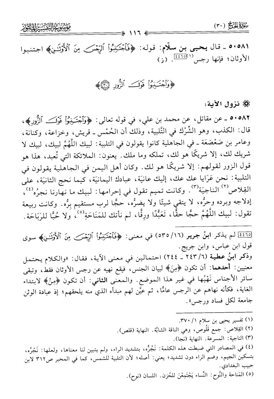 ٥٠٥٨٢ - عن مقاتل، عن محمد بن علي، في قوله تعالى: {واجتنبوا قول الزور}، قال: الكذب، وهو الشِّرْك في التَّلبية، وذلك أن الحُمْس -قريش، وخزاعة، وكنانة، وعامر بن صَعْصَعَة- في الجاهلية كانوا يقولون في التلبية: لبيك اللهم لبيك، لبيك لا شريك لك، إلا شريكًا هو لك، تملكه وما ملك. يعنون: الملائكة التي تُعبد، هذا هو قول الزور لقولهم: إلا شريكًا هو لك. وكان أهل اليمن في الجاهلية يقولون في التلبية: نحن عَرايا عك عك، إليك عانيَة، عبادك اليمانيَة، كيما نحج الثانيَة، على القِلاص (¬٢) الناجيَة (¬٣). وكانت تميم تقول في إحرامها: لبيك ما نهارنا نجرُه (¬٤)، إدلاجه وبرده وحرُّه، لا يتقي شيئًا ولا يضرُّه، حجًّا لرب مستقيم بِرُّه. وكانت ربيعة تقول: لبيك اللهم حجًّا حقًّا، تَعَبُّدًا ورِقًّا، لم نأتك للمَناحَةِ (¬٥)، ولا حُبًّا للرَباحَة.