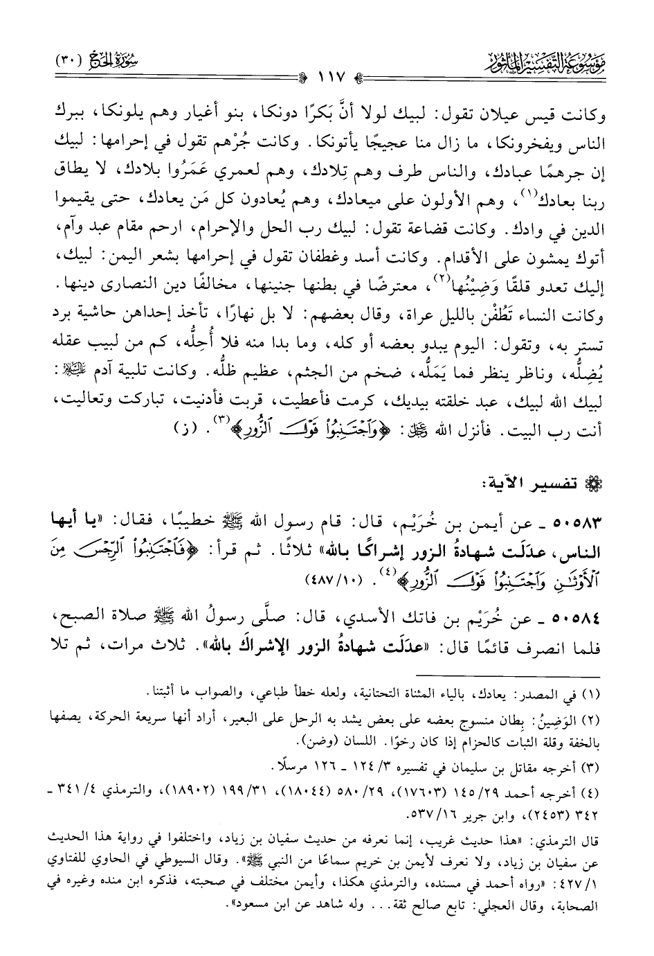 ٥٠٥٨٣ - عن أيمن بن خُرَيْم، قال: قام رسول الله - صلى الله عليه وسلم - خطيبًا، فقال: «يا أيها الناس، عدَلَت شهادةُ الزور إشراكًا بالله» ثلاثًا. ثم قرأ: {فاجتنبوا الرجس من الأوثان واجتنبوا قول الزور} (¬٤). (١٠/ ٤٨٧)