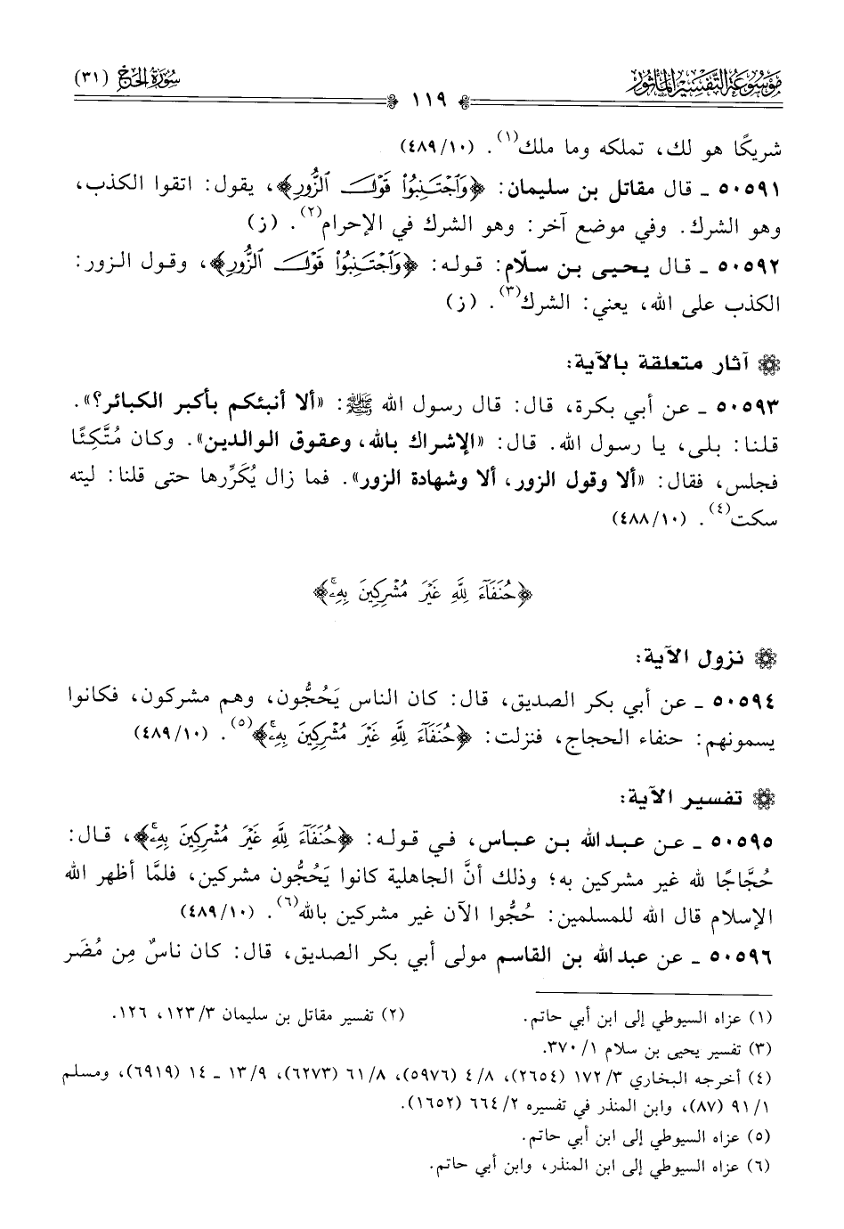 ٥٠٥٩٤ - عن أبي بكر الصديق، قال: كان الناس يَحُجُّون، وهم مشركون، فكانوا يسمونهم: حنفاء الحجاج، فنزلت: {حنفاء لله غير مشركين به} (¬٥). (١٠/ ٤٨٩)