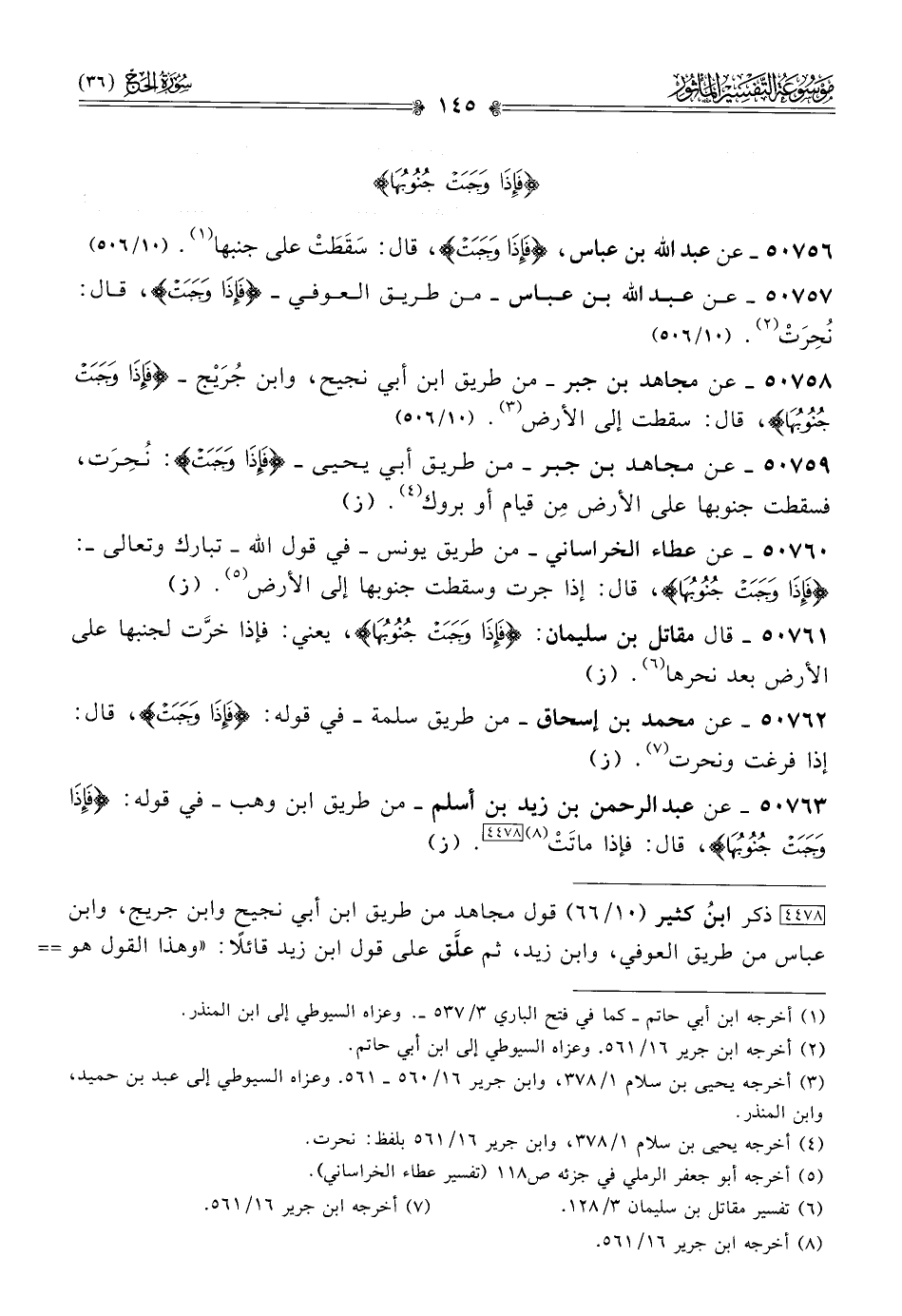 ٥٠٧٥٨ - عن مجاهد بن جبر -من طريق ابن أبي نجيح، وابن جُرَيْج- {فإذا وجبت جنوبها}، قال: سقطت إلى الأرض (¬٣). (١٠/ ٥٠٦)