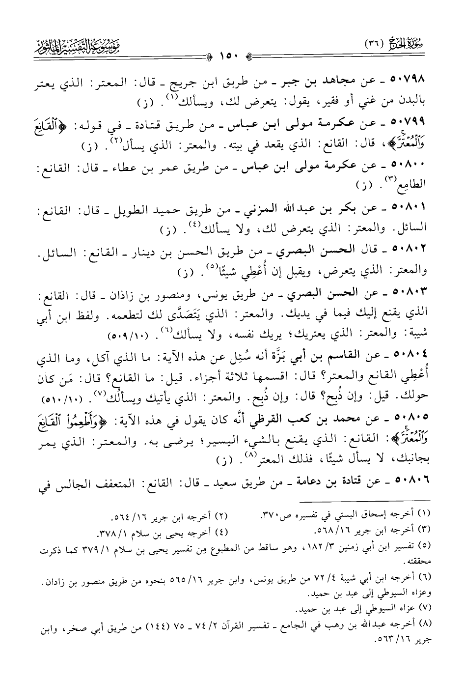 ٥٠٨٠٣ - عن الحسن البصري -من طريق يونس، ومنصور بن زاذان- قال: القانع: الذي يقنع إليك فيما في يديك. والمعتر: الذي يَتَصَدّى لك لتطعمه. ولفظ ابن أبي شيبة: والمعتر: الذي يعتريك؛ يريك نفسه، ولا يسألك (¬٦). (١٠/ ٥٠٩)