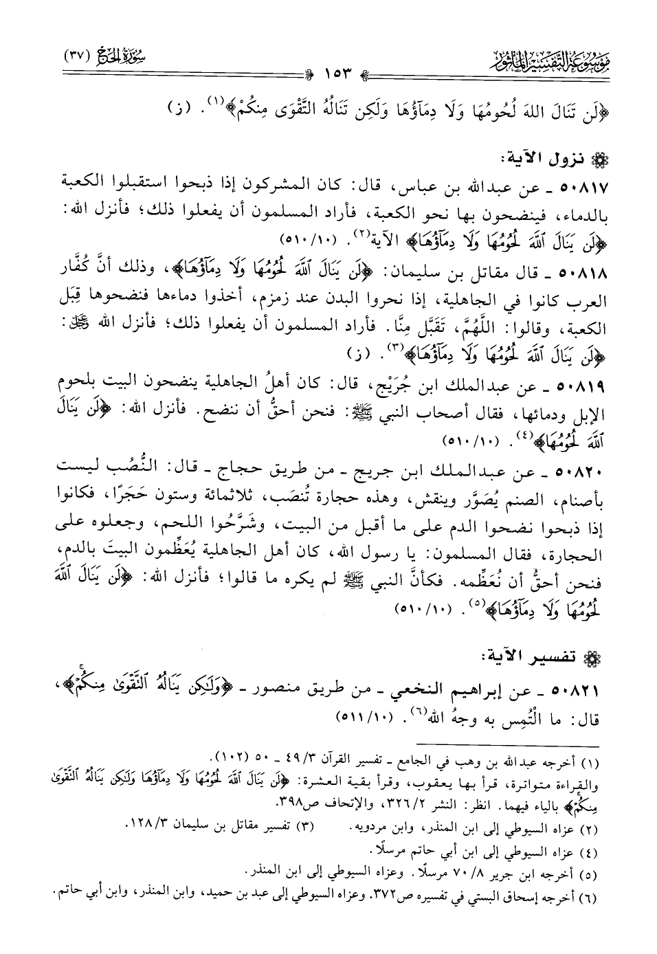 ٥٠٨١٧ - عن عبد الله بن عباس، قال: كان المشركون إذا ذبحوا استقبلوا الكعبة بالدماء، فينضحون بها نحو الكعبة، فأراد المسلمون أن يفعلوا ذلك؛ فأنزل الله: {لن ينال الله لحومها ولا دماؤها} الآية (¬٢). (١٠/ ٥١٠)