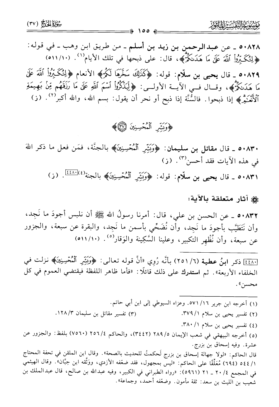 ٥٠٨٣٠ - قال مقاتل بن سليمان: {وبشر المحسنين} بالجنَّة، فمَن فعل ما ذكر اللهَ في هذه الآيات فقد أحسن (¬٣). (ز)