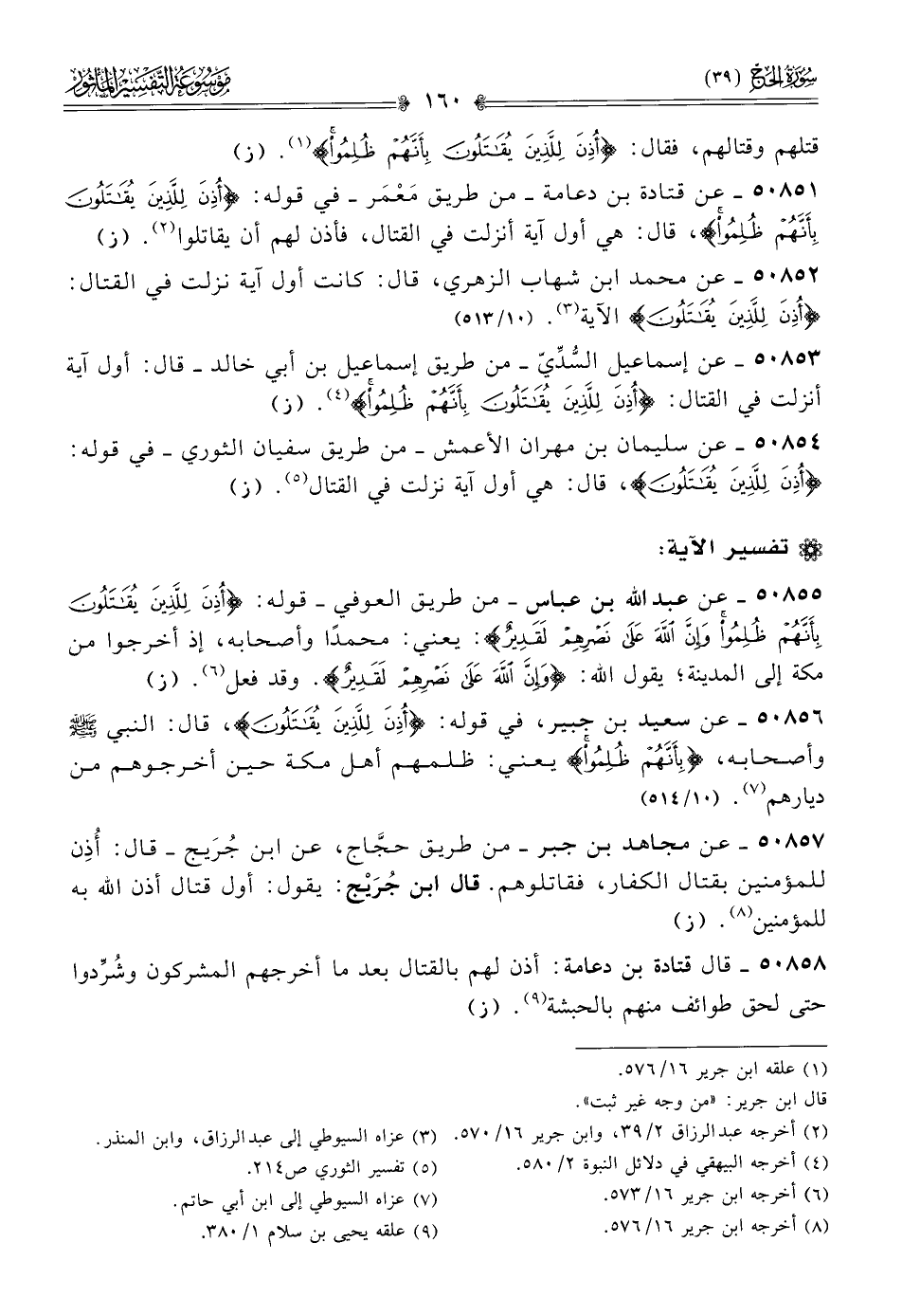 ٥٠٨٥٦ - عن سعيد بن جبير، في قوله: {أذن للذين يقاتلون}، قال: النبي - صلى الله عليه وسلم - وأصحابه، {بأنهم ظلموا} يعني: ظلمهم أهل مكة حين أخرجوهم من ديارهم (¬٧). (١٠/ ٥١٤)