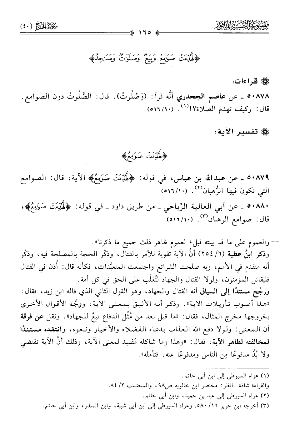 ٥٠٨٨٠ - عن أبي العالية الرِّياحي -من طريق داود- في قوله: {لهدمت صوامع}، قال: صوامع الرهبان (¬٣). (١٠/ ٥١٦)