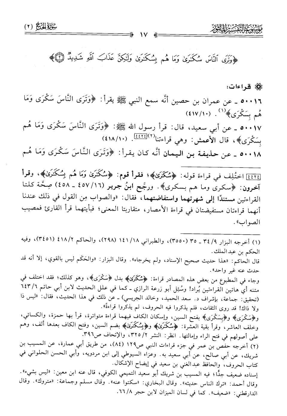 وجاء في المطبوع من بعض هذه المصادر قراءة: {سكارى} بدل «سَكْرى»، وهو كذلك؛ فقد اختلف في متنه أي هاتين القراءتين يُراد! وسُئِل أبو زرعة الرازي -كما في علل الحديث لابن أبي حاتم ٦/ ٦٤٣ (تحقيق: جماعة، بإشراف د. سعد الحميد، وخالد الجريسي) - عن ذلك في هذا الحديث، فقال: «ليس ذا ولا ذاك! قد روى الثقات، فلم يذكروا فيه الحروف، لم يذكروا قراءةً».