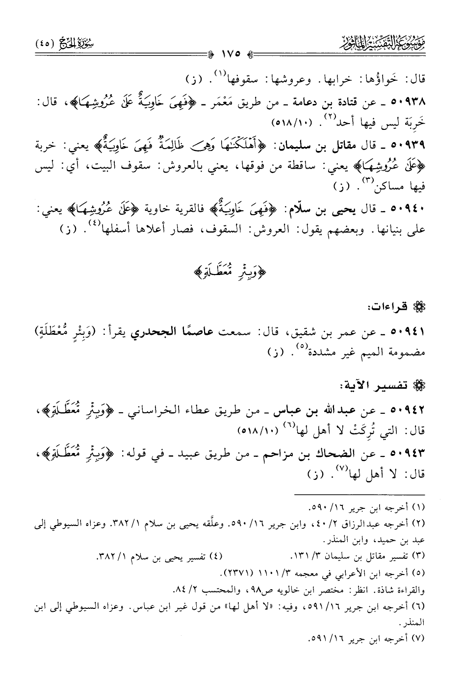 ٥٠٩٣٨ - عن قتادة بن دعامة -من طريق مَعْمَر- {فهي خاوية على عروشها}، قال: خَرِبَة ليس فيها أحد (¬٢). (١٠/ ٥١٨)