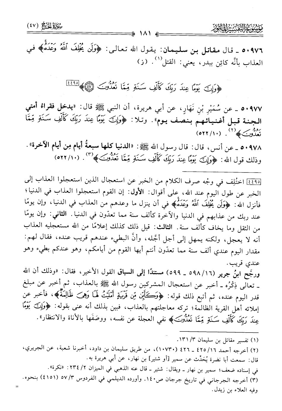 ٥٠٩٧٨ - عن أنس، قال: قال رسول الله - صلى الله عليه وسلم -: «الدنيا كلها سبعةُ أيام مِن أيام الآخرة». وذلك قول الله: {وإن يوما عند ربك كألف سنة مما تعدون} (¬٣). (١٠/ ٥٢٢)