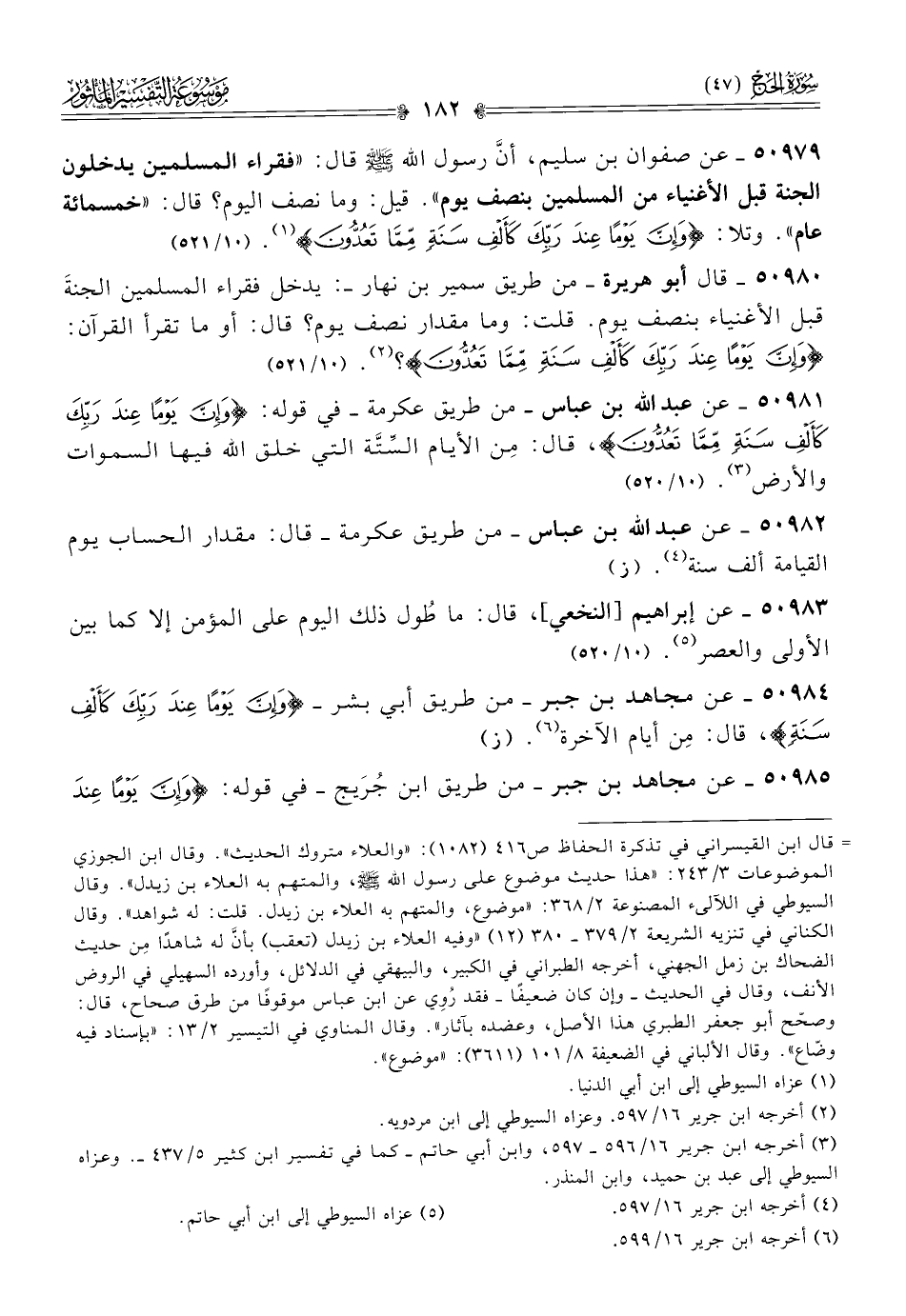 ٥٠٩٧٩ - عن صفوان بن سليم، أنّ رسول الله - صلى الله عليه وسلم - قال: «فقراء المسلمين يدخلون الجنة قبل الأغنياء من المسلمين بنصف يوم». قيل: وما نصف اليوم؟ قال: «خمسمائة عام». وتلا: {وان يوما عند ربك كألف سنة مما تعدون} (¬١). (١٠/ ٥٢٢)