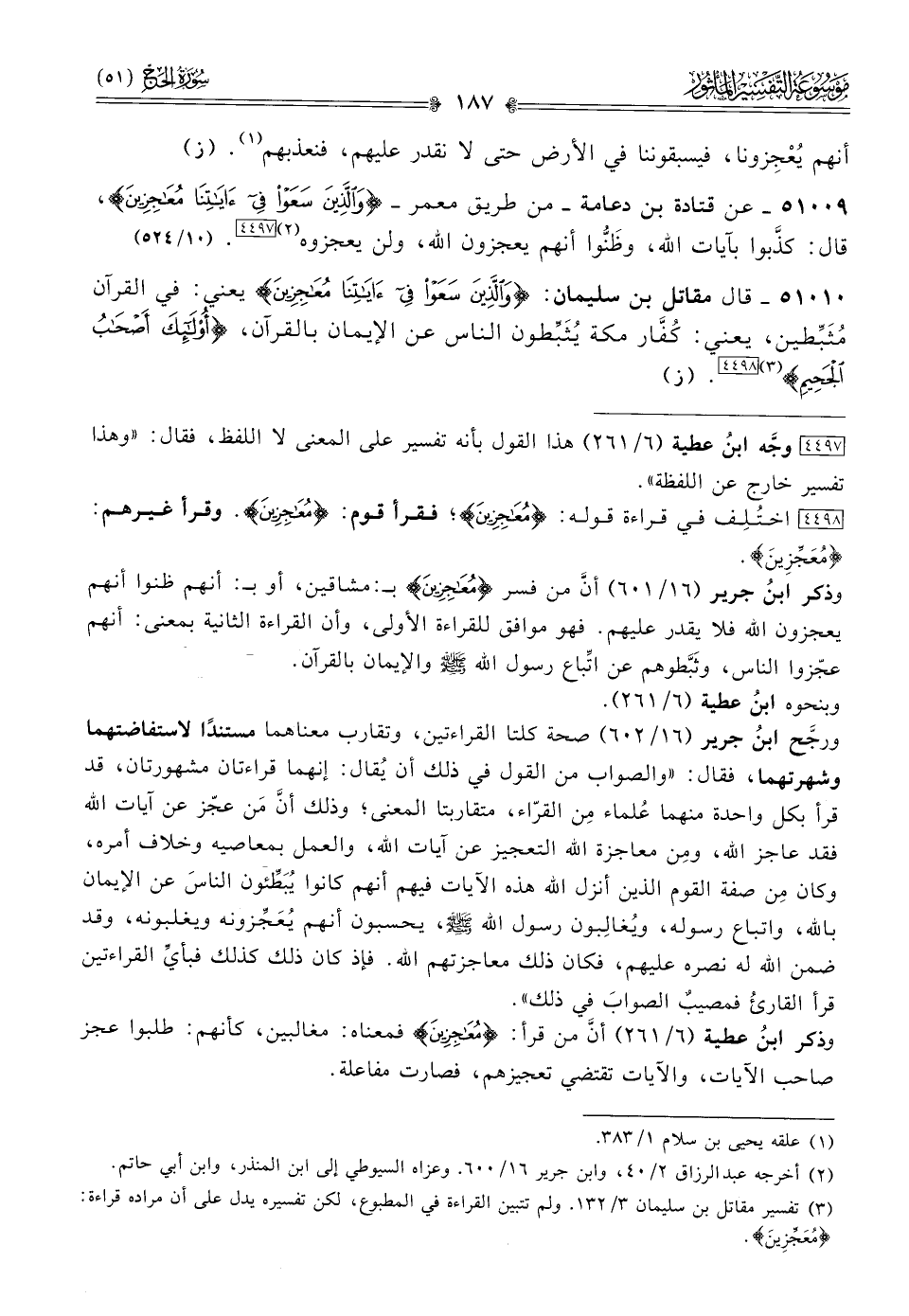 [٤٤٩٨] اختُلِف في قراءة قوله: {معاجزين}؛ فقرأ قوم: {معاجزين}. وقرأ غيرهم: «مُعَجِّزِينَ».