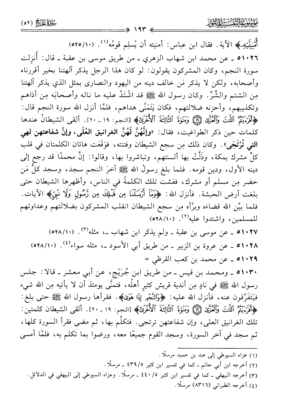 ٥١٠٢٦ - عن محمد ابن شهاب الزهري -من طريق موسى بن عقبة- قال: لَمّا أُنزِلت سورة النجم، وكان المشركون يقولون: لو كان هذا الرجل يذكر آلهتنا بخير أقررناه وأصحابه، ولكن لا يذكر مَن خالف دينه من اليهود والنصارى بمثل الذي يذكر آلهتنا مِن الشتم والشَّرِّ. وكان رسول الله - صلى الله عليه وسلم - قد اشْتَدَّ عليه ما ناله وأصحابَه مِن أذاهم وتكذيبهم، وأحزنه ضلالتهم، فكان يَتَمَنّى هداهم، فلمّا أنزل الله سورة النجم قال: {أفرأيتم اللات والعزى ومناة الثالثة الأخرى} [النجم: ١٩ - ٢٠]. ألقى الشيطانُ عندها كلمات حين ذكر الطواغيت، فقال: «وإنّهُنَّ لَهُنَّ الغرانيق العُلى، وإنّ شفاعتهن لهي التي تُرْتَجى». وكان ذلك مِن سجع الشيطان وفتنته، فوَقَعَت هاتان الكلمتان في قلب كلِّ مشرك بمكة، وذَلَّتْ بها ألسنتهم، وتباشروا بها، وقالوا: إنّ محمدًا قد رجع إلى دينه الأول، ودين قومه. فلما بلغ رسولُ الله - صلى الله عليه وسلم - آخرَ النجم سجد، وسجد كلُّ مَن حضر مِن مسلم أو مشرك، ففشت تلك الكلمةُ في الناس، وأظهرها الشيطان حتى بلغت أرض الحبشة. فأنزل الله: {وما أرسلنا من قبلك من رسول ولا نبي} الآيات. فلما بيَّن الله قضاءَه وبرَّأه مِن سجع الشيطان انقلب المشركون بضلالتهم وعداوتهم للمسلمين، واشتدوا عليه (¬٢). (١٠/ ٥٢٨)