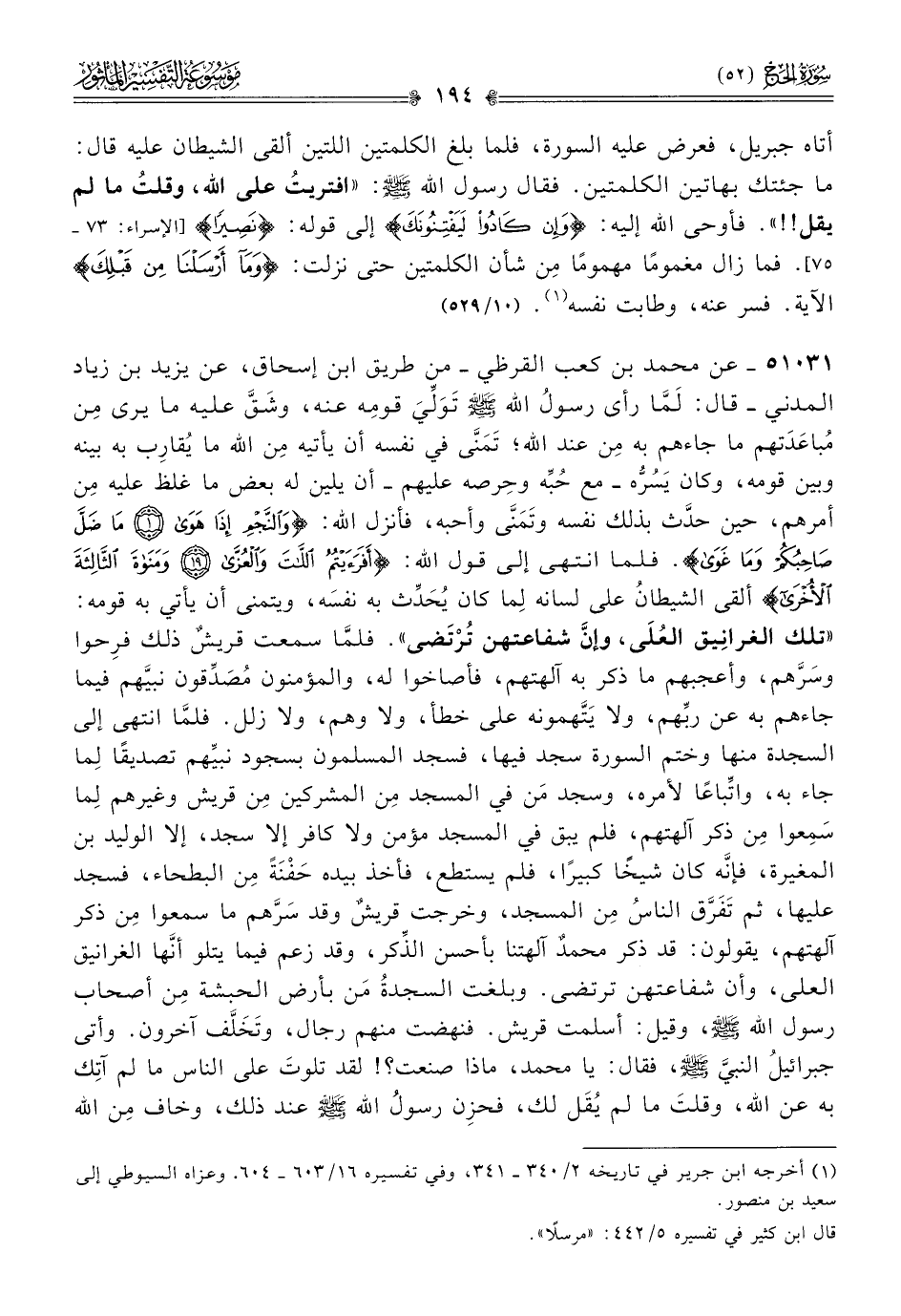 ٥١٠٣١ - عن محمد بن كعب القرظي -من طريق ابن إسحاق، عن يزيد بن زياد المدني- قال: لَمّا رأى رسولُ الله - صلى الله عليه وسلم - تَوَلِّيَ قومِه عنه، وشَقَّ عليه ما يرى مِن مُباعَدَتهم ما جاءهم به مِن عند الله؛ تَمَنّى في نفسه أن يأتيه مِن الله ما يُقارِب به بينه وبين قومه، وكان يَسُرُّه -مع حُبِّه وحِرصه عليهم- أن يلين له بعض ما غلظ عليه مِن أمرهم، حين حدَّث بذلك نفسه وتَمَنّى وأحبه، فأنزل الله: {والنجم إذا هوى ما ضل صاحبكم وما غوى}. فلما انتهى إلى قول الله: {أفرأيتم اللات والعزى ومناة الثالثة الأخرى} ألقى الشيطانُ على لسانه لِما كان يُحَدِّث به نفسَه، ويتمنى أن يأتي به قومه: «تلك الغرانِيق العُلى، وإنّ شفاعتهن تُرْتَضى». فلمّا سمعت قريشٌ ذلك فرِحوا وسَرَّهم، وأعجبهم ما ذكر به آلهتهم، فأصاخوا له، والمؤمنون مُصَدِّقون نبيَّهم فيما جاءهم به عن ربِّهم، ولا يَتَّهمونه على خطأ، ولا وهم، ولا زلل. فلمّا انتهى إلى السجدة منها وختم السورة سجد فيها، فسجد المسلمون بسجود نبيِّهم تصديقًا لِما جاء به، واتِّباعًا لأمره، وسجد مَن في المسجد مِن المشركين مِن قريش وغيرهم لِما سَمِعوا مِن ذكر آلهتهم، فلم يبق في المسجد مؤمن ولا كافر إلا سجد، إلا الوليد بن المغيرة، فإنّه كان شيخًا كبيرًا، فلم يستطع، فأخذ بيده حَفْنَةً مِن البطحاء، فسجد عليها، ثم تَفَرَّق الناسُ مِن المسجد، وخرجت قريشٌ وقد سَرَّهم ما سمعوا مِن ذكر آلهتهم، يقولون: قد ذكر محمدٌ آلهتنا بأحسن الذِّكر، وقد زعم فيما يتلو أنّها الغرانيق العلى، وأن شفاعتهن ترتضى. وبلغت السجدةُ مَن بأرض الحبشة مِن أصحاب رسول الله - صلى الله عليه وسلم -، وقيل: أسلمت قريش. فنهضت منهم رجال، وتَخَلَّف آخرون. وأتى جبرائيلُ النبيَّ - صلى الله عليه وسلم -، فقال: يا محمد، ماذا صنعت؟! لقد تلوتَ على الناس ما لم آتِك به عن الله، وقلتَ ما لم يُقَل لك، فحزِن رسولُ الله - صلى الله عليه وسلم - عند ذلك، وخاف مِن الله