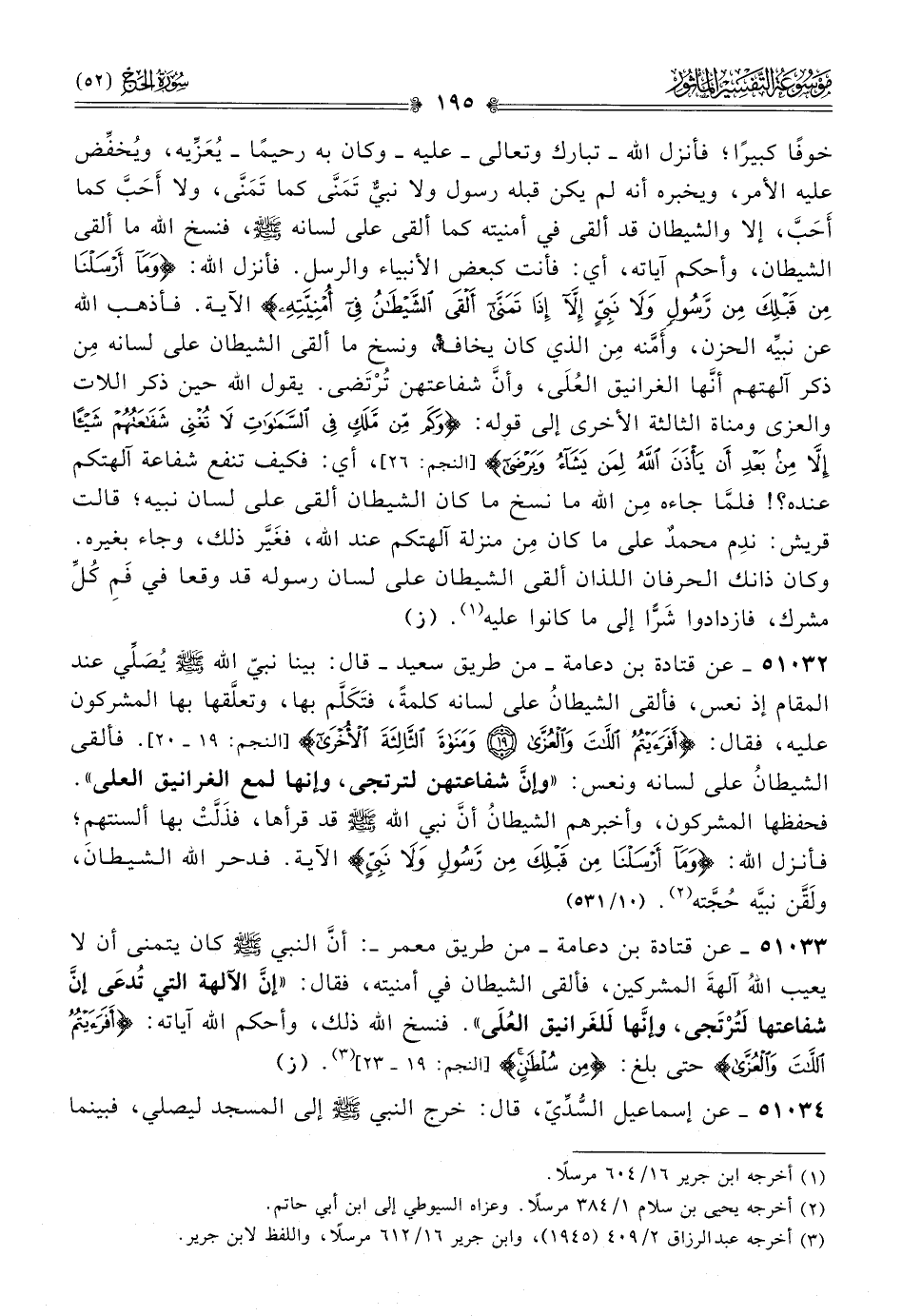 ٥١٠٣٣ - عن قتادة بن دعامة -من طريق معمر-: أنّ النبي - صلى الله عليه وسلم - كان يتمنى أن لا يعيب اللهُ آلهةَ المشركين، فألقى الشيطان في أمنيته، فقال: «إنّ الآلهة التي تُدعى إنّ شفاعتها لَتُرْتَجى، وإنّها لَلغَرانيق العُلى». فنسخ الله ذلك، وأحكم الله آياته: {أفرأيتم اللات والعزى} حتى بلغ: {من سلطان} [النجم: ١٩ - ٢٣] (¬٣). (ز)