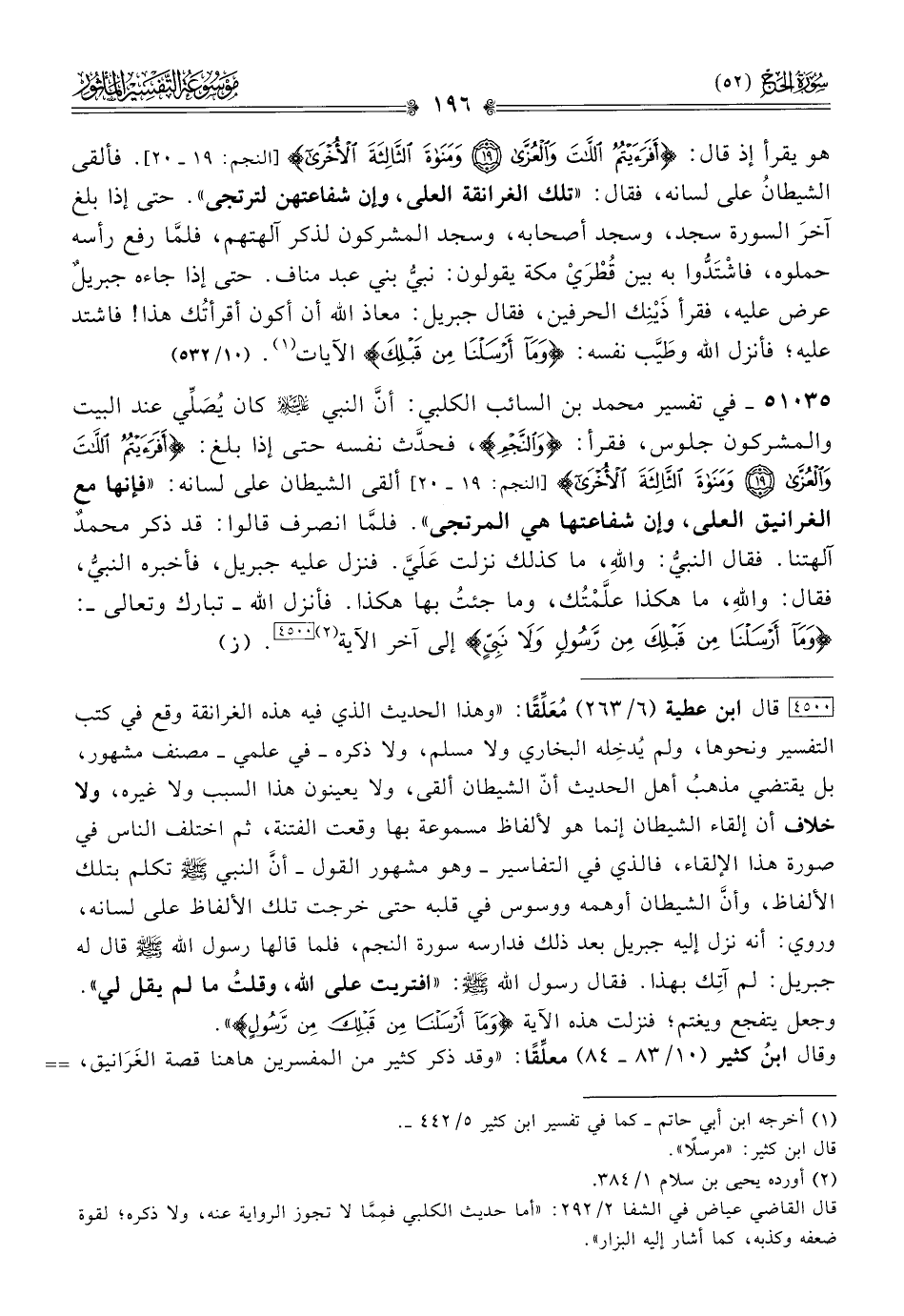 وقال ابنُ كثير (١٠/ ٨٣ - ٨٤) معلِّقًا: «وقد ذكر كثير من المفسرين هاهنا قصة الغَرانيق، وما كان من رجوع كثير من المهاجرة إلى أرض الحبشة ظَنًّا منهم أن مشركي قريش قد أسلموا. ولكنها من طرق كلها مرسلة، ولم أرها مسندة من وجه صحيح».
