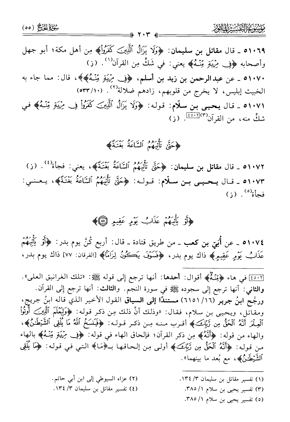 ٥١٠٦٩ - قال مقاتل بن سليمان: {ولا يزال الذين كفروا} مِن أهل مكة؛ أبو جهل وأصحابه {في مرية منه} يعني: في شَكٍّ مِن القرآن (¬١). (ز)