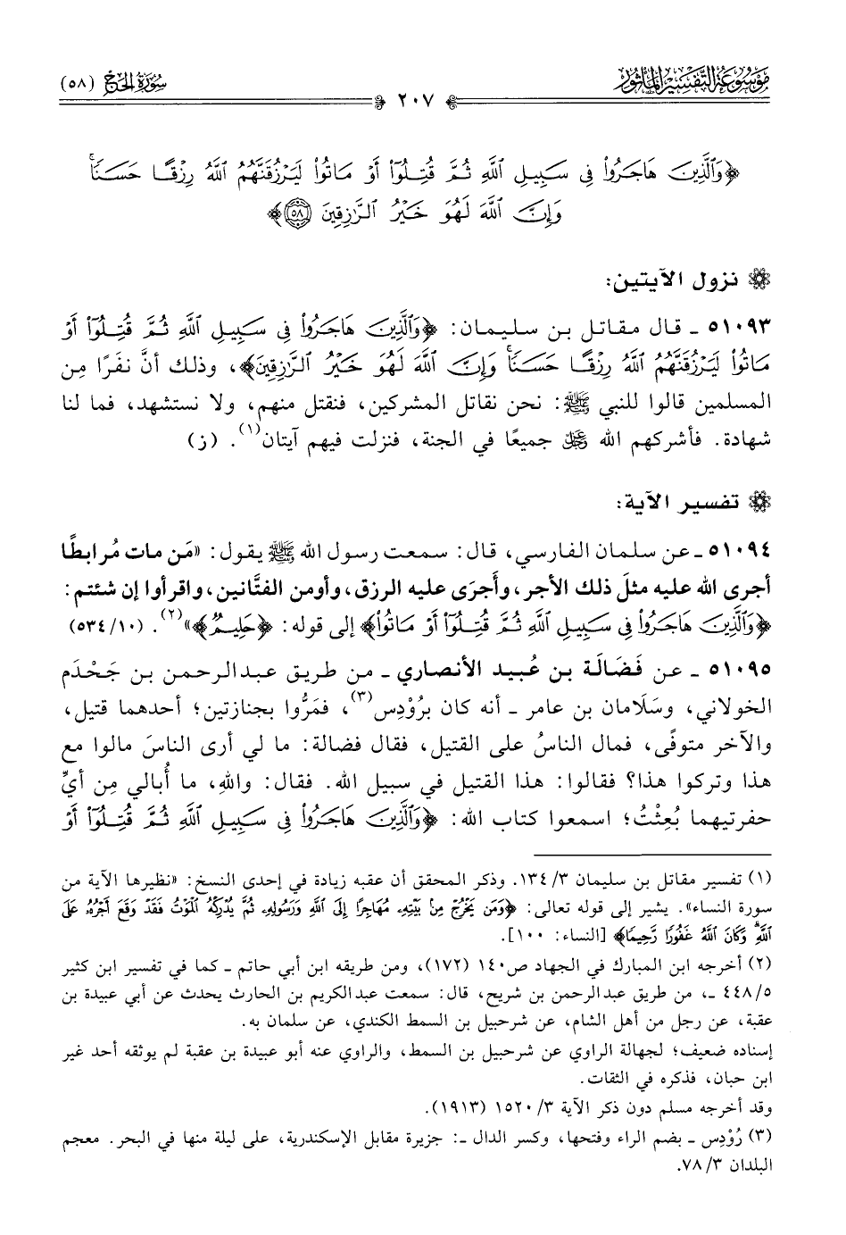 ٥١٠٩٣ - قال مقاتل بن سليمان: {والذين هاجروا في سبيل الله ثم قتلوا أو ماتوا ليرزقنهم الله رزقا حسنا وإن الله لهو خير الرازقين}، وذلك أنّ نفَرًا مِن المسلمين قالوا للنبي - صلى الله عليه وسلم -: نحن نقاتل المشركين، فنقتل منهم، ولا نستشهد، فما لنا شهادة. فأشركهم الله - عز وجل - جميعًا في الجنة، فنزلت فيهم آيتان (¬١). (ز)