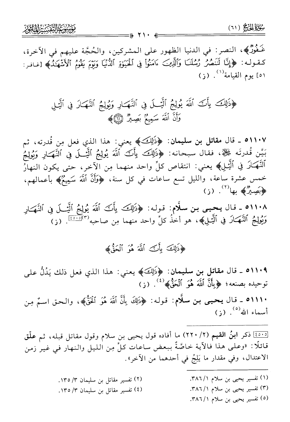 ٥١١٠٨ - قال يحيى بن سلّام: قوله: {ذلك بأن الله يولج الليل في النهار ويولج النهار في الليل}، هو أخذُ كلِّ واحد منهما مِن صاحبه (¬٣) [٤٥٠٥]. (ز)