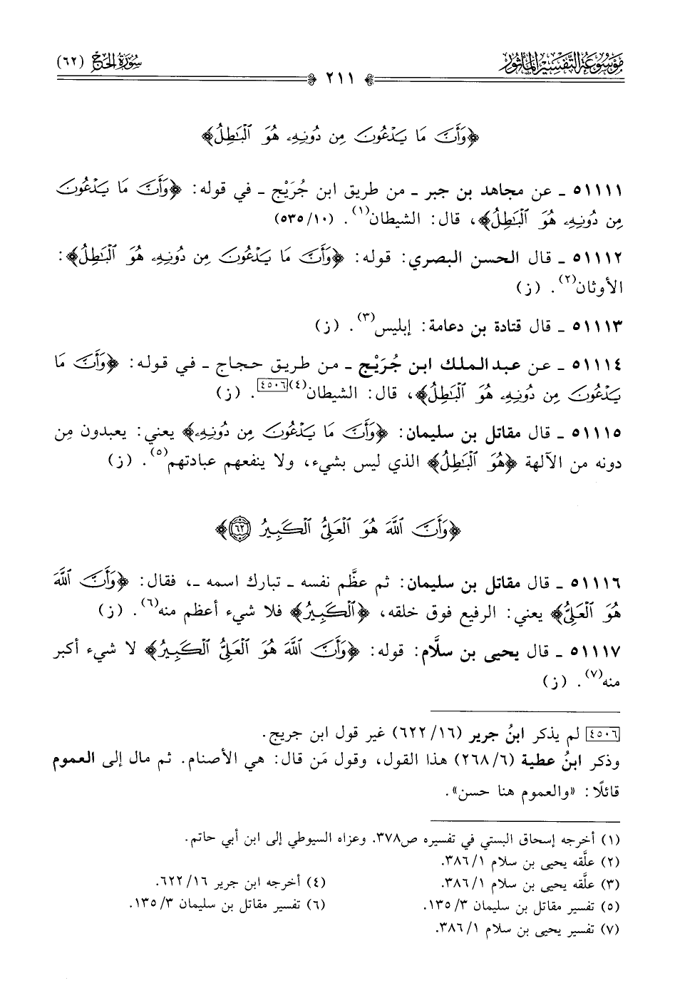 ٥١١١٤ - عن عبد الملك ابن جُرَيْج -من طريق حجاج- في قوله: {وأن ما يدعون من دونه هو الباطل}، قال: الشيطان (¬٤) [٤٥٠٦]. (ز)