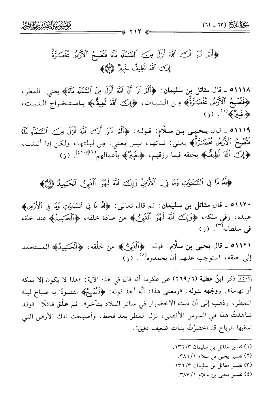 ٥١١١٩ - قال يحيى بن سلّام: قوله: {ألم تر أن الله أنزل من السماء ماء فتصبح الأرض مخضرة} يعني: نباتها، ليس يعني: مِن ليلتها، ولكن إذا أنبتت، {إن الله لطيف} بخلقه فيما رزقهم، {خبير} بأعمالهم (¬٢) [٤٥٠٧]. (ز)