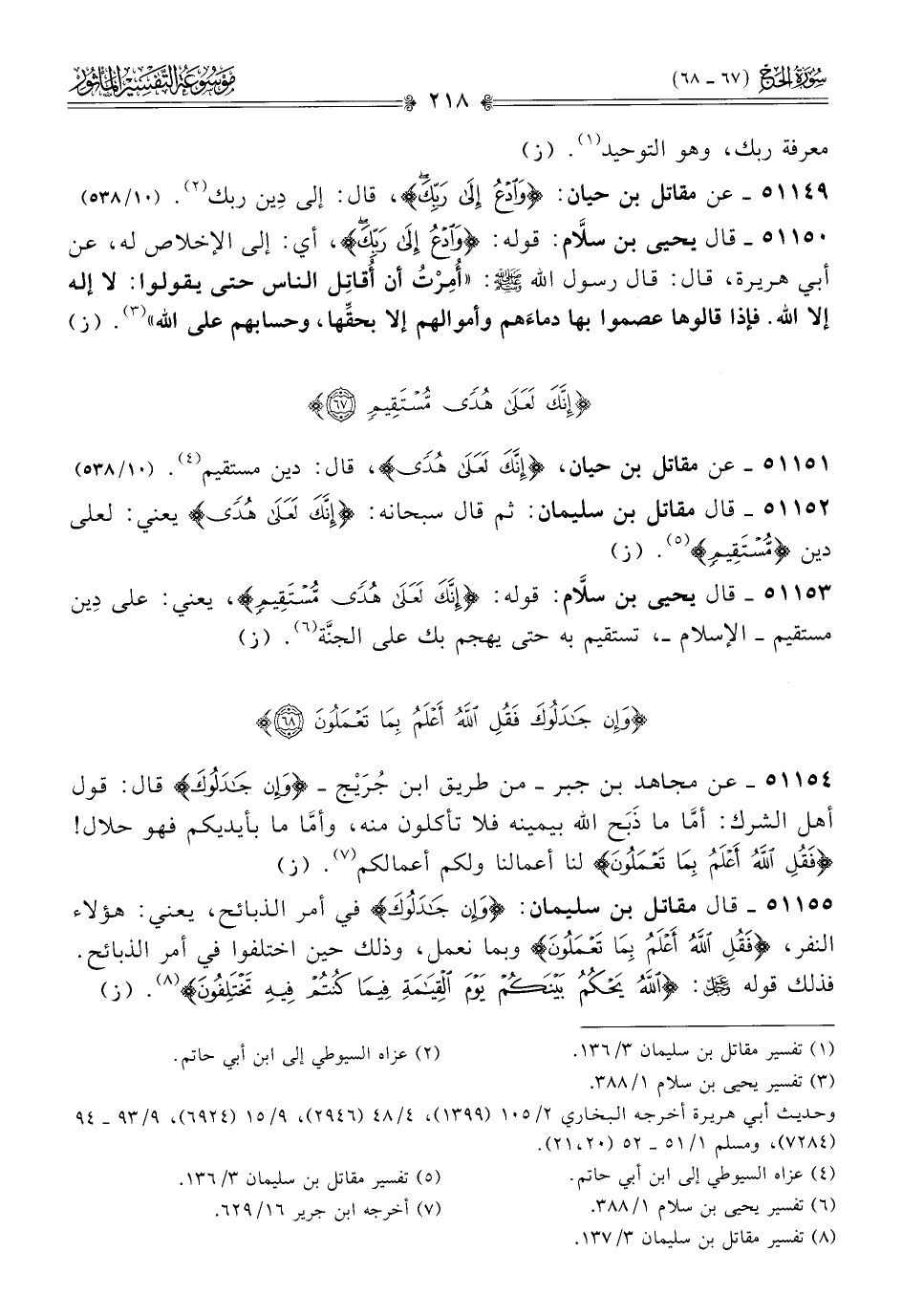 ٥١١٥٠ - قال يحيى بن سلّام: قوله: {وادع إلى ربك}، أي: إلى الإخلاص له، عن أبي هريرة، قال: قال رسول الله - صلى الله عليه وسلم -: «أُمِرْتُ أن أُقاتِل الناس حتى يقولوا: لا إله إلا الله. فإذا قالوها عصموا بها دماءَهم وأموالهم إلا بحقِّها، وحسابهم على الله» (¬٣). (ز)