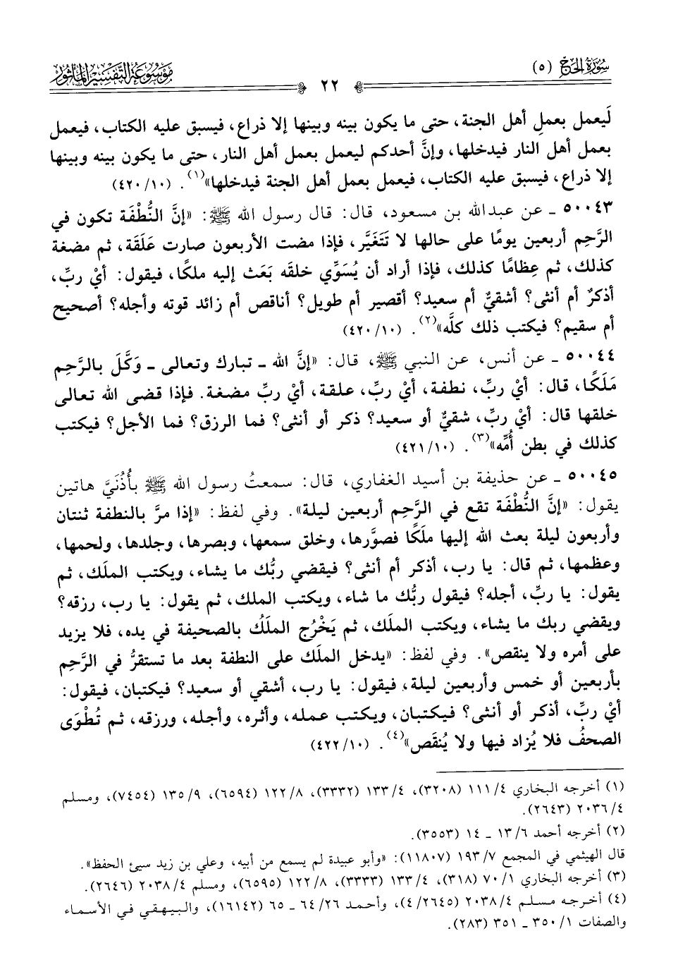 ٥٠٠٤٥ - عن حذيفة بن أسيد الغفاري، قال: سمعتُ رسول الله - صلى الله عليه وسلم - بأُذُنَيَّ هاتين يقول: «إنّ النُّطْفَة تقع في الرَّحِم أربعين ليلة». وفي لفظ: «إذا مرَّ بالنطفة ثنتان وأربعون ليلة بعث الله إليها ملَكًا فصوَّرها، وخلق سمعها، وبصرها، وجلدها، ولحمها، وعظمها، ثم قال: يا رب، أذكر أم أنثى؟ فيقضي ربُّك ما يشاء، ويكتب الملَك، ثم يقول: يا ربِّ، أجله؟ فيقول ربُّك ما شاء، ويكتب الملك، ثم يقول: يا رب، رزقه؟ ويقضي ربك ما يشاء، ويكتب الملَك، ثم يَخْرُج الملَكُ بالصحيفة في يده، فلا يزيد على أمره ولا ينقص». وفي لفظ: «يدخل الملَك على النطفة بعد ما تستقرُّ في الرَّحِم بأربعين أو خمس وأربعين ليلة، فيقول: يا رب، أشقي أو سعيد؟ فيكتبان، فيقول: أيْ ربِّ، أذكر أو أنثى؟ فيكتبان، ويكتب عمله، وأثره، وأجله، ورزقه، ثم تُطْوى الصحفُ فلا يُزاد فيها ولا يُنقَص» (¬٤). (١٠/ ٤٢٢)