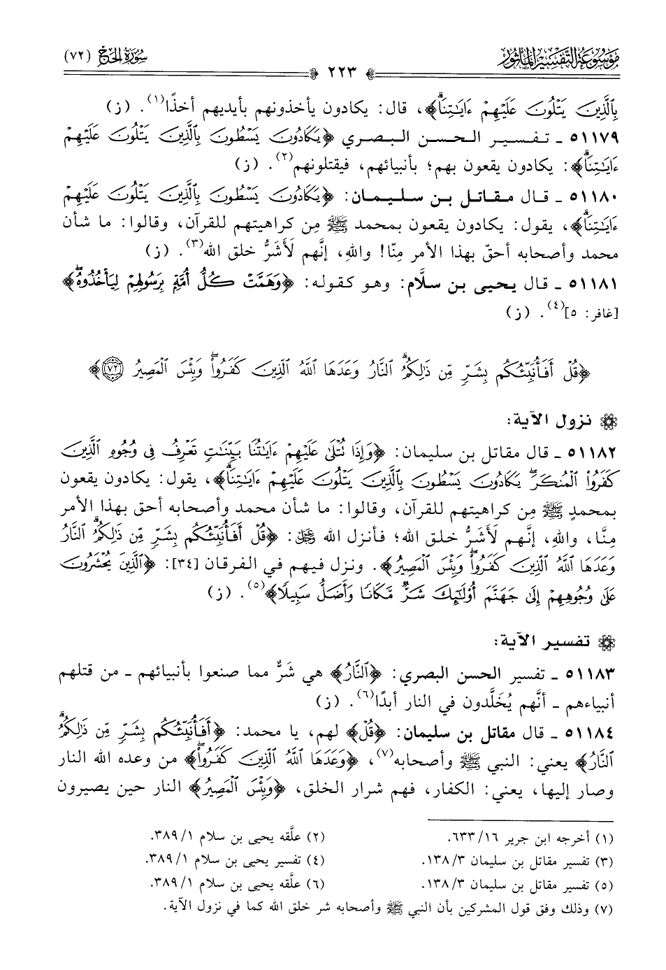 ٥١١٨٢ - قال مقاتل بن سليمان: {وإذا تتلى عليهم آياتنا بينات تعرف في وجوه الذين كفروا المنكر يكادون يسطون بالذين يتلون عليهم آياتنا}، يقول: يكادون يقعون بمحمدٍ - صلى الله عليه وسلم - مِن كراهيتهم للقرآن، وقالوا: ما شأن محمد وأصحابه أحق بهذا الأمر مِنّا، واللهِ، إنّهم لَأَشَرُّ خلق الله؛ فأنزل الله - عز وجل -: {قل أفأنبئكم بشر من ذلكم النار وعدها الله الذين كفروا وبئس المصير}. ونزل فيهم في الفرقان [٣٤]: {الذين يحشرون على وجوههم إلى جهنم أولئك شر مكانا وأضل سبيلا} (¬٥). (ز)