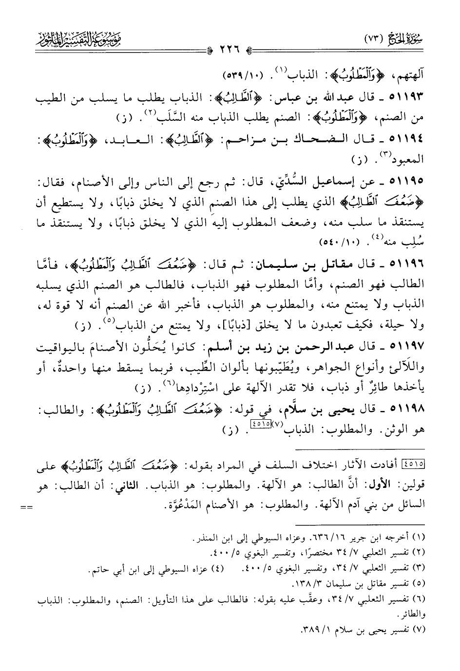 ٥١١٩٣ - قال عبد الله بن عباس: {الطالب}: الذباب يطلب ما يسلب من الطيب من الصنم، و {المطلوب}: الصنم يطلب الذباب منه السَّلَب (¬٢). (ز)
