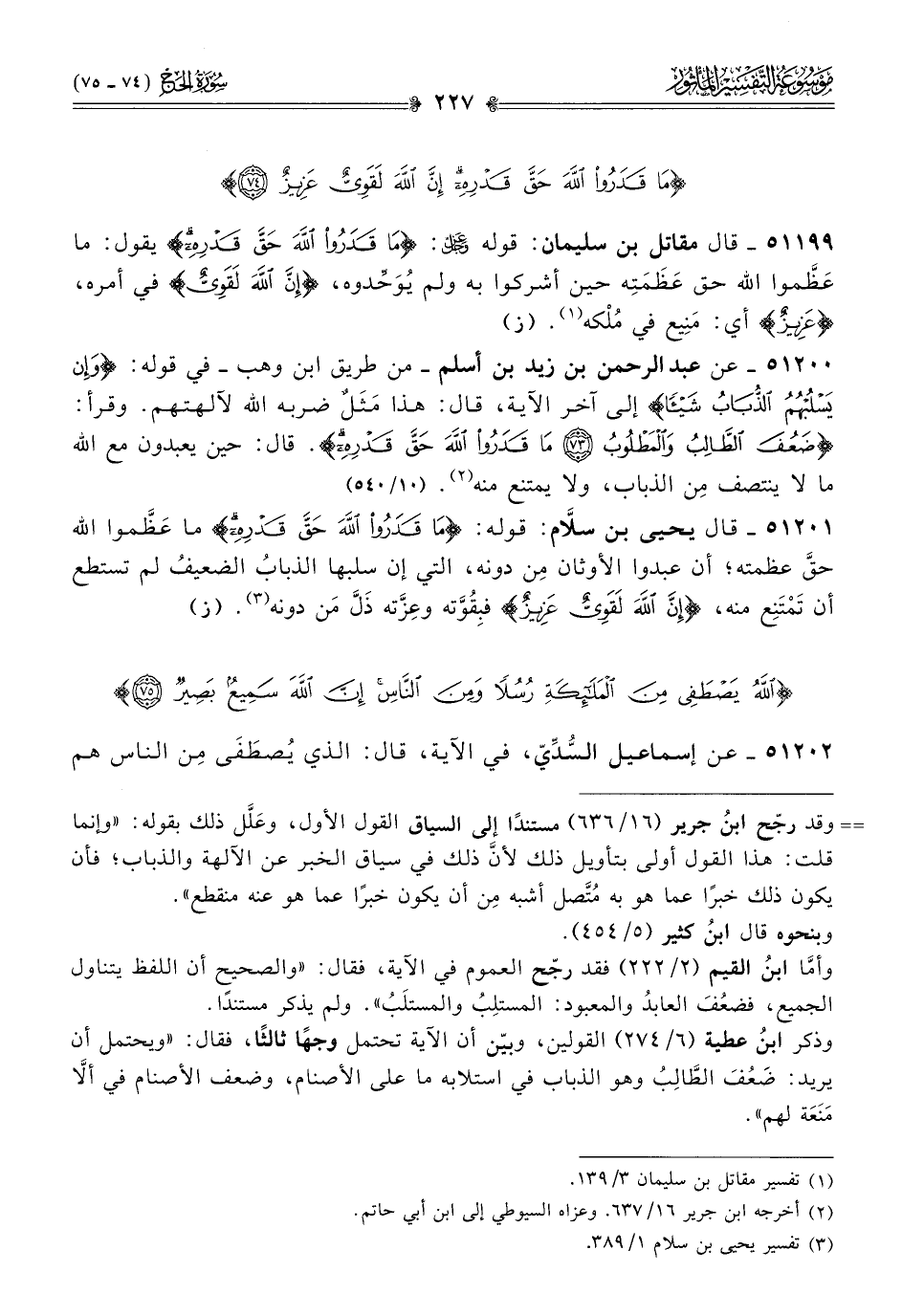 ٥١٢٠١ - قال يحيى بن سلّام: قوله: {ما قدروا الله حق قدره} ما عَظَّموا الله حقَّ عظمته؛ أن عبدوا الأوثان مِن دونه، التي إن سلبها الذبابُ الضعيفُ لم تستطع أن تَمْتَنِع منه، {إن الله لقوي عزيز} فبِقُوَّته وعِزَّته ذَلَّ مَن دونه (¬٣). (ز)