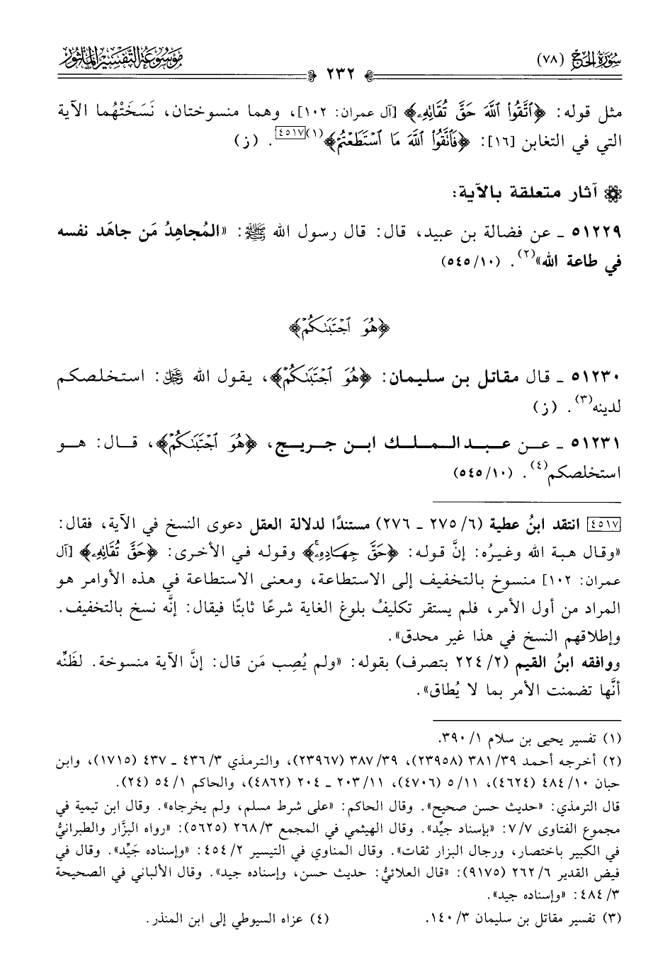 [٤٥١٧] انتقد ابنُ عطية (٦/ ٢٧٥ - ٢٧٦) مستندًا لدلالة العقل دعوى النسخ في الآية، فقال: «وقال هبة الله وغيرُه: إنّ قوله: {حَقَّ جِهادِهِ} وقوله في الأخرى: {حَقَّ تُقاتِهِ} [آل عمران: ١٠٢] منسوخ بالتخفيف إلى الاستطاعة، ومعنى الاستطاعة في هذه الأوامر هو المراد من أول الأمر، فلم يستقر تكليفُ بلوغ الغاية شرعًا ثابتًا فيقال: إنّه نسخ بالتخفيف. وإطلاقهم النسخ في هذا غير محدق».