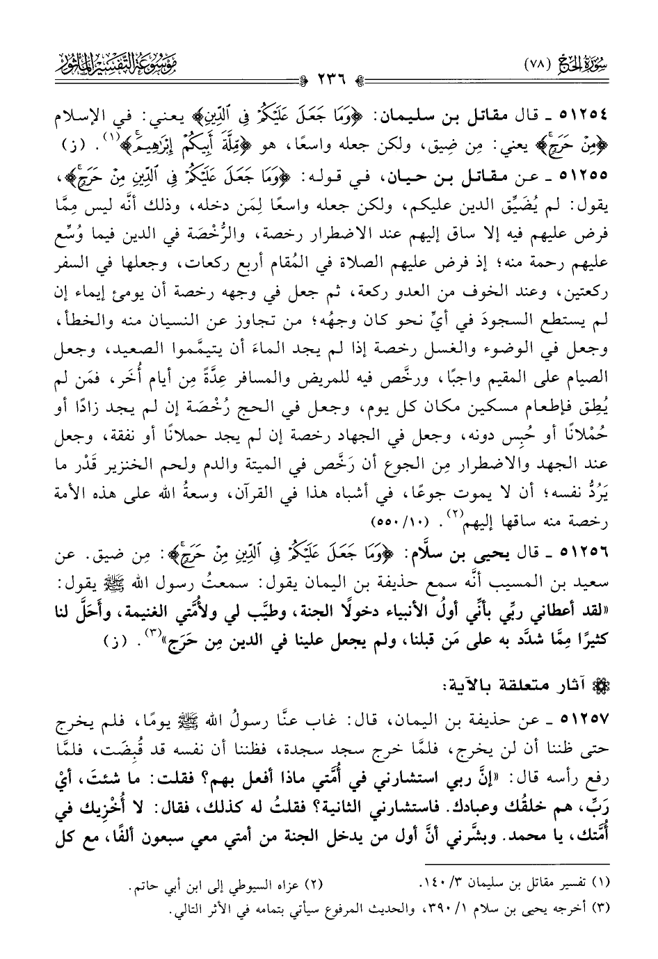 ٥١٢٥٦ - قال يحيى بن سلّام: {وما جعل عليكم في الدين من حرج}: مِن ضيق. عن سعيد بن المسيب أنّه سمع حذيفة بن اليمان يقول: سمعتُ رسول الله - صلى الله عليه وسلم - يقول: «لقد أعطاني ربِّي بأنِّي أولُ الأنبياء دخولًا الجنة، وطيَّب لي ولأُمَّتي الغنيمة، وأَحَلَّ لنا كثيرًا مِمّا شدَّد به على مَن قبلنا، ولم يجعل علينا في الدين مِن حَرَج» (¬٣). (ز)