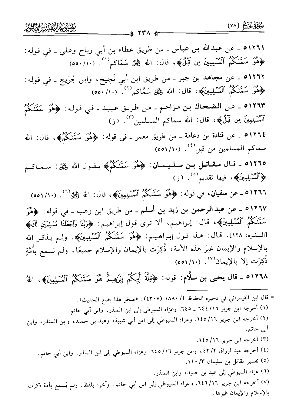 ٥١٢٦٦ - عن سفيان، في قوله: {هو سماكم المسلمين}، قال: الله - عز وجل - (¬٦). (١٠/ ٥٥١)