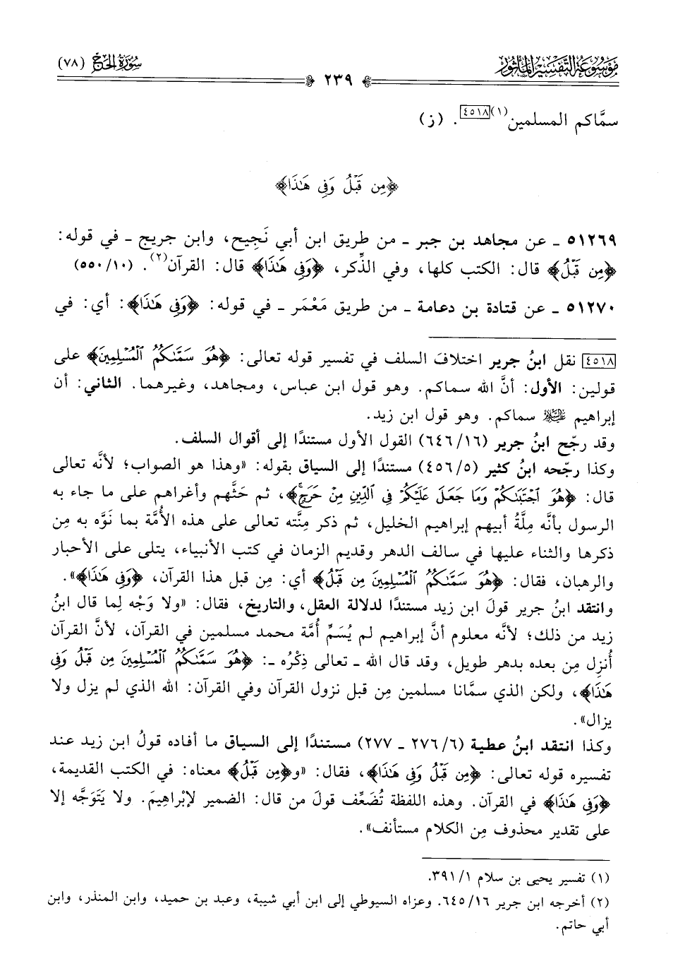وكذا رجّحه ابنُ كثير (٥/ ٤٥٦) مستندًا إلى السياق بقوله: «وهذا هو الصواب؛ لأنّه تعالى قال: {هو اجتباكم وما جعل عليكم في الدين من حرج}، ثم حَثَّهم وأغراهم على ما جاء به الرسول - صلى الله عليه وسلم - بأنّه مِلَّةُ أبيهم إبراهيم الخليل، ثم ذكر مِنَّته تعالى على هذه الأُمَّة بما نَوَّه به مِن ذكرها والثناء عليها في سالف الدهر وقديم الزمان في كتب الأنبياء، يتلى على الأحبار والرهبان، فقال: {هو سماكم المسلمين من قبل} أي: مِن قبل هذا القرآن، {وفي هذا}».