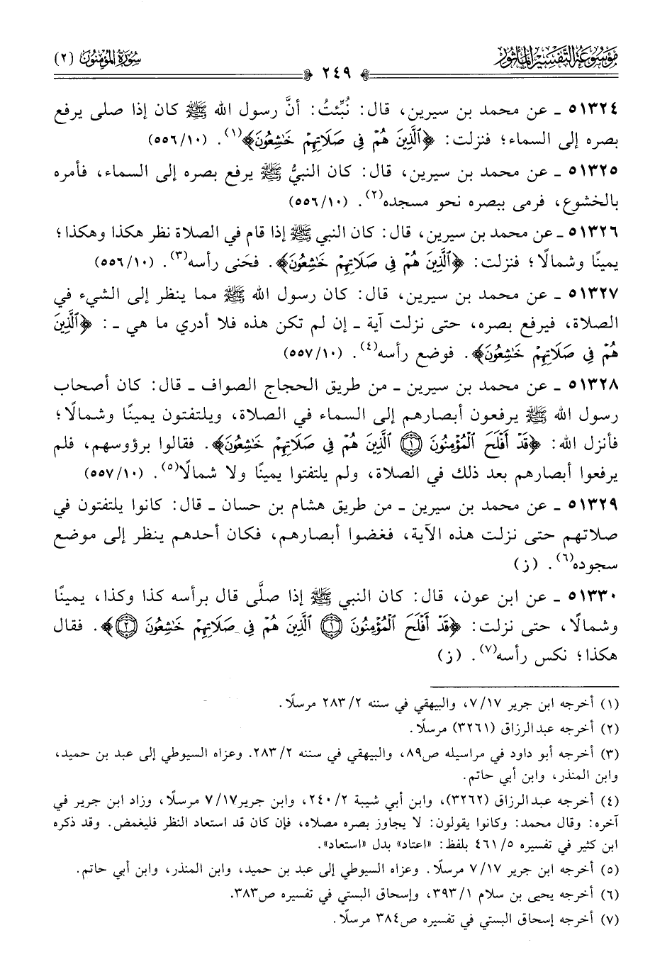 ٥١٣٢٤ - عن محمد بن سيرين، قال: نُبِّئتُ: أنّ رسول الله - صلى الله عليه وسلم - كان إذا صلى يرفع بصره إلى السماء؛ فنزلت: {الذين هم في صلاتهم خاشعون} (¬١). (١٠/ ٥٥٦)