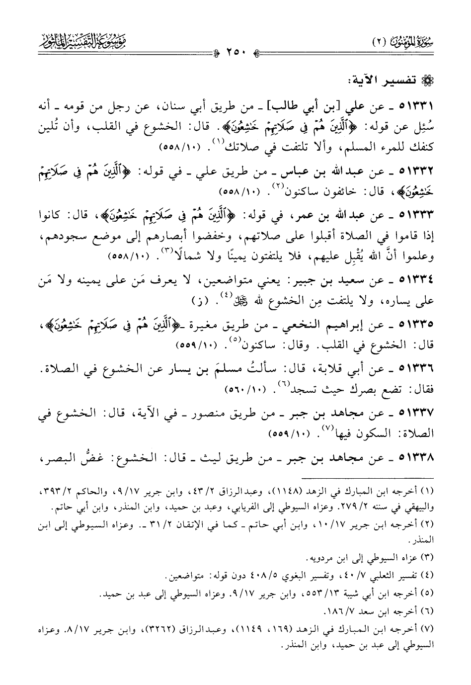 ٥١٣٣٣ - عن عبد الله بن عمر، في قوله: {الذين هم في صلاتهم خاشعون}، قال: كانوا إذا قاموا في الصلاة أقبلوا على صلاتهم، وخفضوا أبصارهم إلى موضع سجودهم، وعلموا أنّ الله يُقْبِل عليهم، فلا يلتفتون يمينًا ولا شمالًا (¬٣). (١٠/ ٥٥٨)