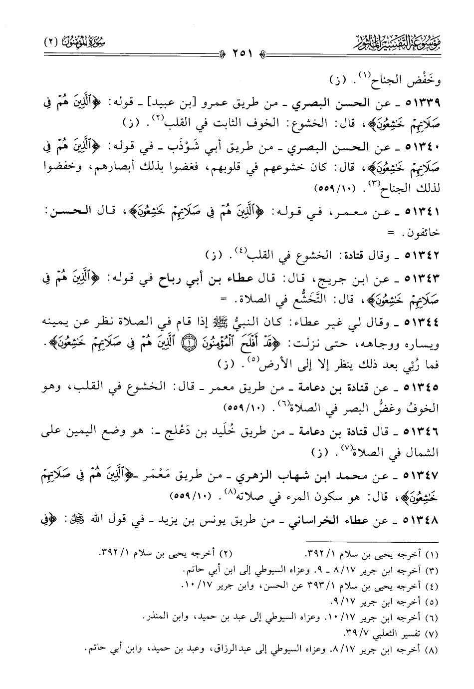 ٥١٣٤٠ - عن الحسن البصري -من طريق أبي شَوْذَب- في قوله: {الذين هم في صلاتهم خاشعون}، قال: كان خشوعهم في قلوبهم، فغضوا بذلك أبصارهم، وخفضوا لذلك الجناح (¬٣). (١٠/ ٥٥٩)
