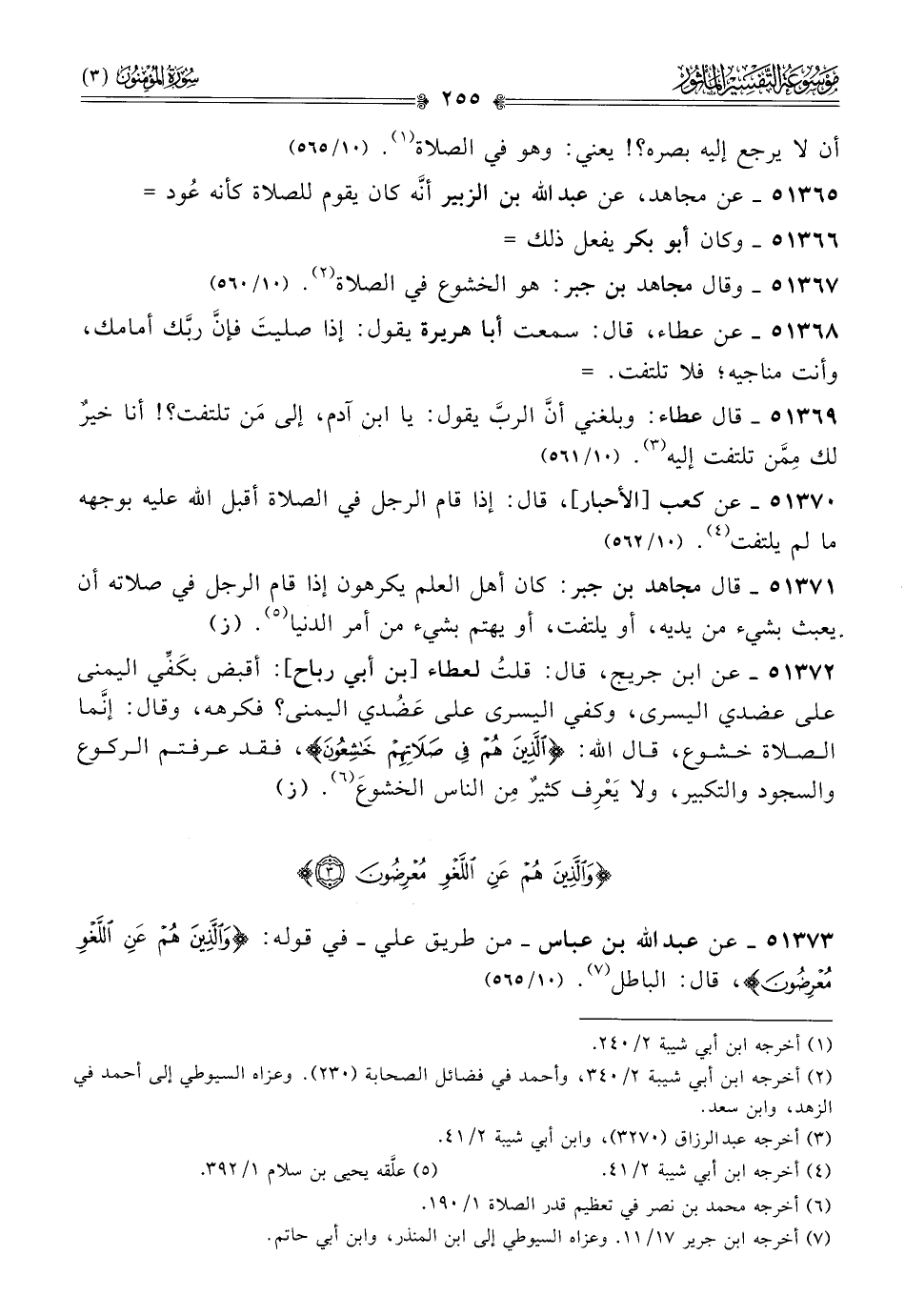 ٥١٣٧٠ - عن كعب [الأحبار]، قال: إذا قام الرجل في الصلاة أقبل الله عليه بوجهه ما لم يلتفت (¬٤). (١٠/ ٥٦٢)