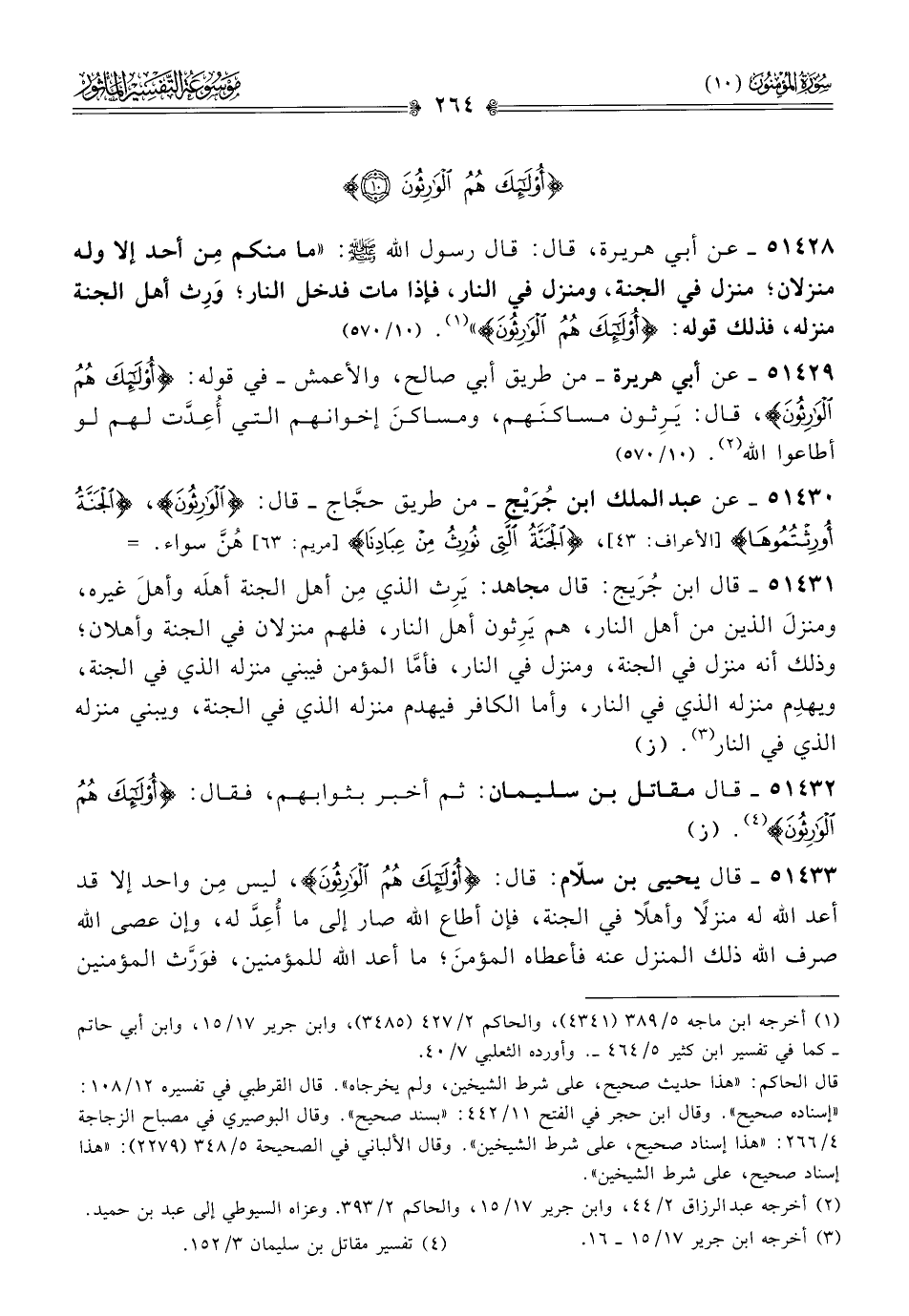 ٥١٤٢٨ - عن أبي هريرة، قال: قال رسول الله - صلى الله عليه وسلم -: «ما منكم مِن أحد إلا وله منزلان؛ منزل في الجنة، ومنزل في النار، فإذا مات فدخل النار؛ ورِث أهل الجنة منزله، فذلك قوله: {أولئك هم الوارثون}» (¬١). (١٠/ ٥٧٠)