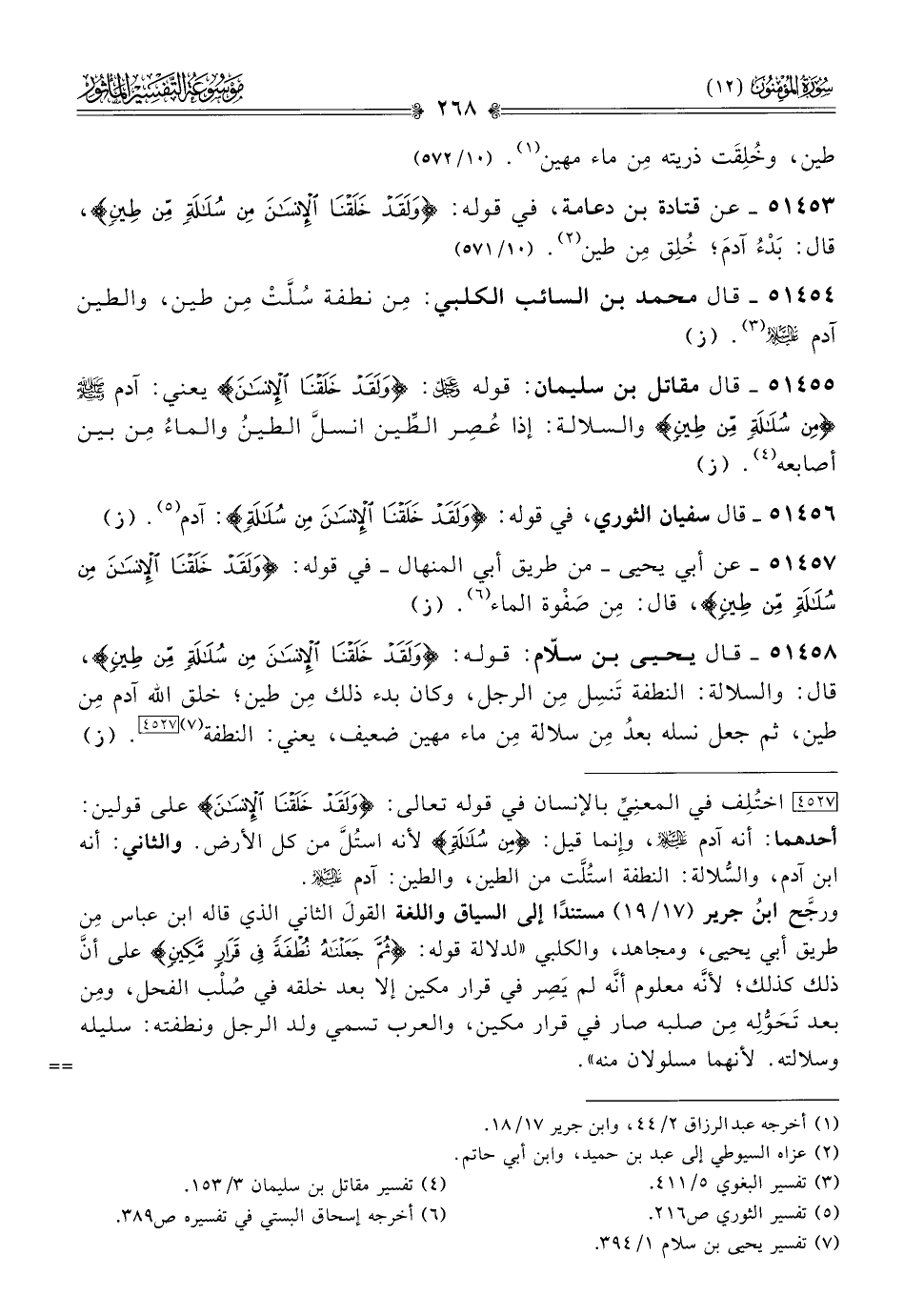 ٥١٤٥٦ - قال سفيان الثوري، في قوله: {لقد خلقنا الإنسان من سلالة}: آدم (¬٥). (ز)
