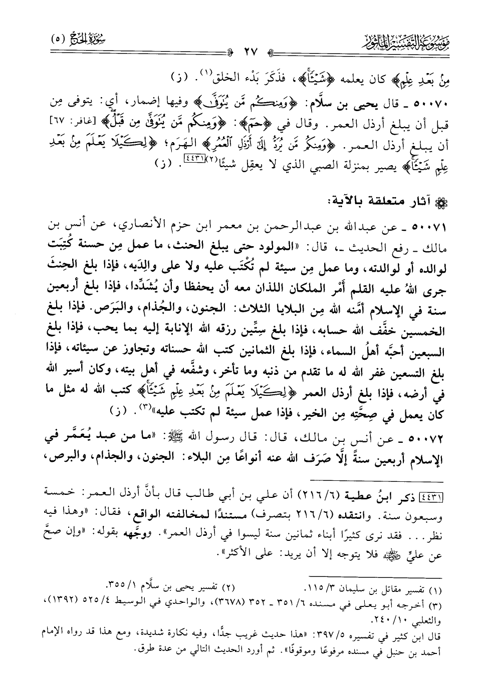 [٤٤٣١] ذكر ابنُ عطية (٦/ ٢١٦) أن علي بن أبي طالب قال بأنّ أرذل العمر: خمسة وسبعون سنة. وانتقده (٦/ ٢١٦ بتصرف) مستندًا لمخالفته الواقع، فقال: «وهذا فيه نظر ... فقد نرى كثيرًا أبناء ثمانين سنة ليسوا في أرذل العمر». ووجَّهه بقوله: «وإن صحَّ عن عليٍّ - رضي الله عنهما - فلا يتوجه إلا أن يريد: على الأكثر».