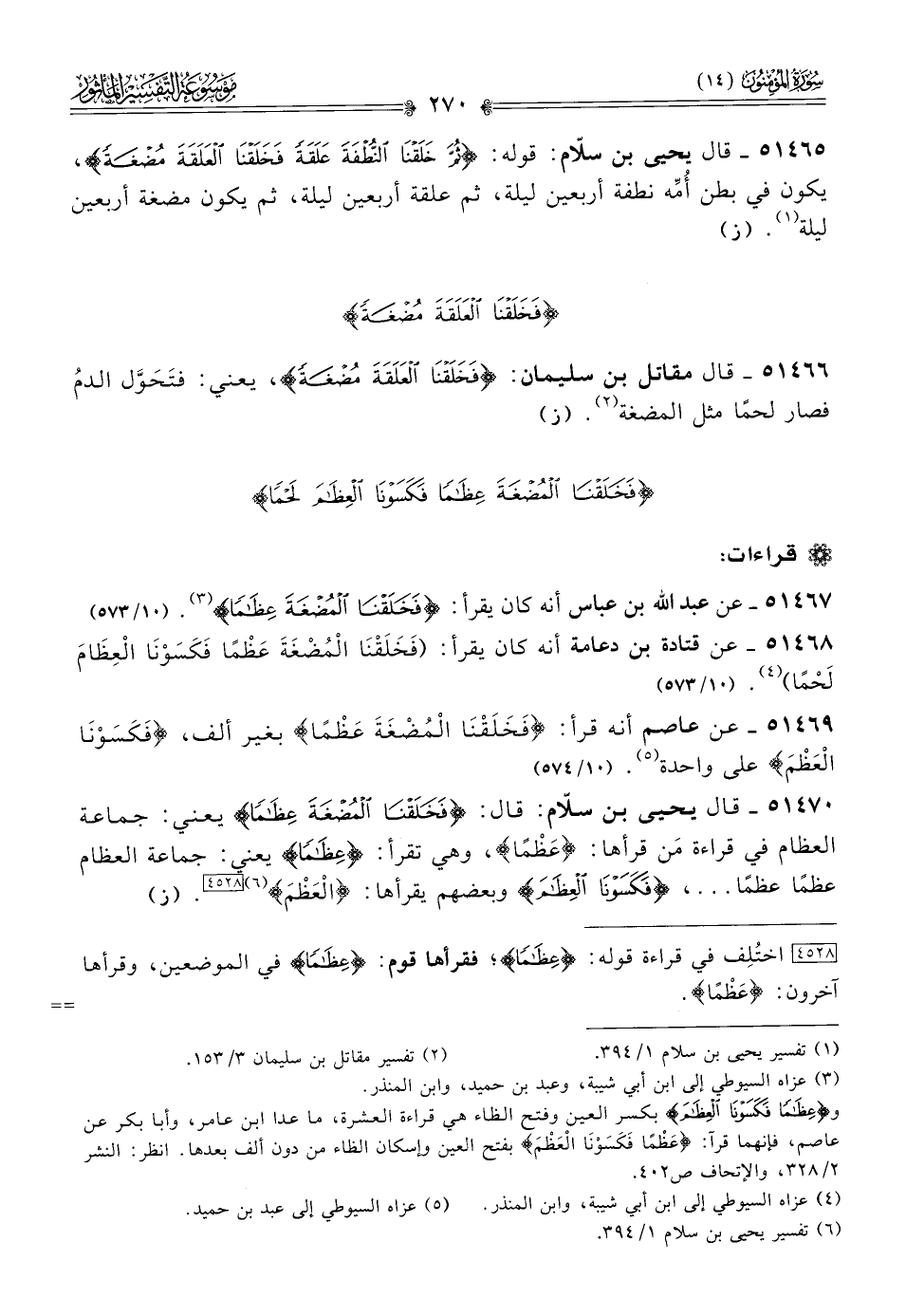 ٥١٤٦٨ - عن قتادة بن دعامة أنه كان يقرأ: (فَخَلَقْنا المُضْغَةَ عَظْمًا فَكَسَوْنا العِظامَ لَحْمًا) (¬٤). (١٠/ ٥٧٣)