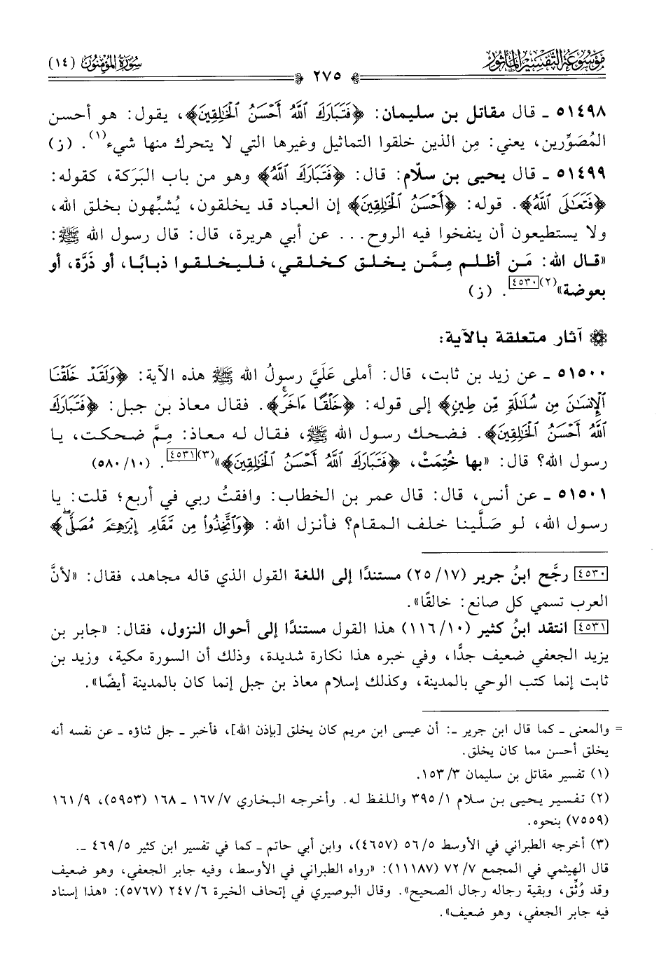 ٥١٤٩٩ - قال يحيى بن سلّام: قال: {فتبارك الله} وهو من باب البَرَكة، كقوله: {فتعالى الله}. قوله: {أحسن الخالقين} إن العباد قد يخلقون، يُشبِّهون بخلق الله، ولا يستطيعون أن ينفخوا فيه الروح ... عن أبي هريرة، قال: قال رسول الله - صلى الله عليه وسلم -: «قال الله: مَن أظلم مِمَّن يخلق كخلقي، فليخلقوا ذبابًا، أو ذَرَّة، أو بعوضة» (¬٢) [٤٥٣٠]. (ز)