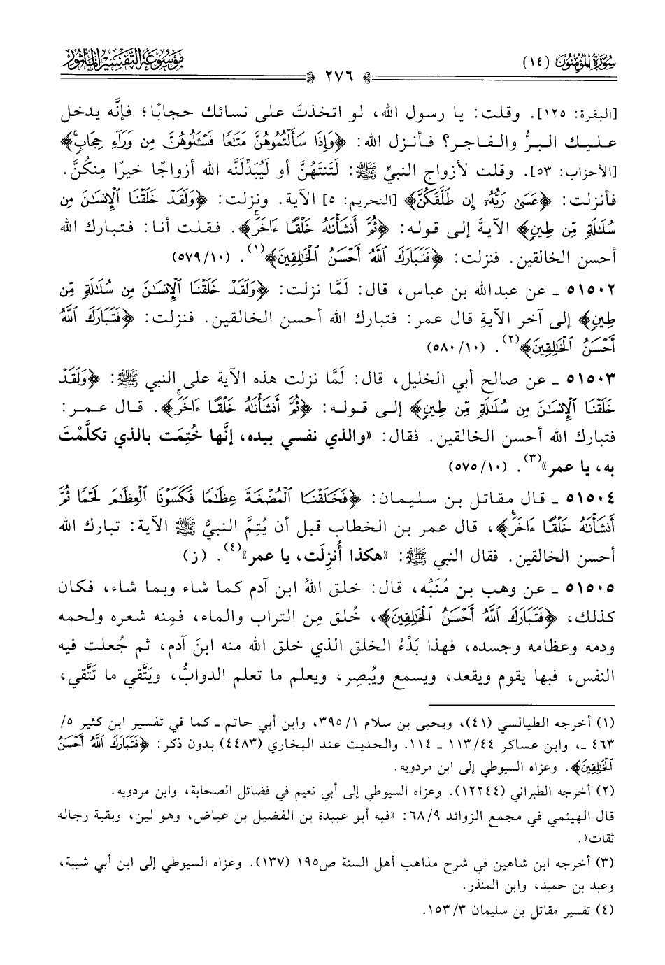 ٥١٥٠٢ - عن عبد الله بن عباس، قال: لَمّا نزلت: {ولقد خلقنا الانسان من سلالة من طين} إلى آخر الآيةِ قال عمر: فتبارك الله أحسن الخالقين. فنزلت: {فتبارك الله أحسن الخالقين} (¬٢). (١٠/ ٥٨٠)
