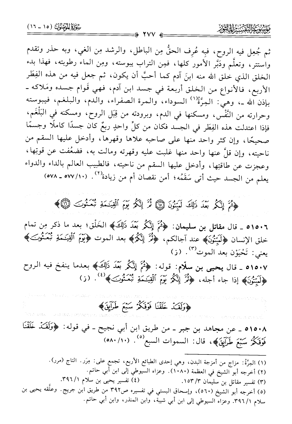 ٥١٥٠٦ - قال مقاتل بن سليمان: {ثم إنكم بعد ذلك} الخَلْق؛ بعد ما ذكر مِن تمام خلق الإنسان {لميتون} عند آجالكم، {ثم إنكم} بعد الموت {يوم القيامة تبعثون} يعني: تَحْيَوْن بعد الموت (¬٣). (ز)
