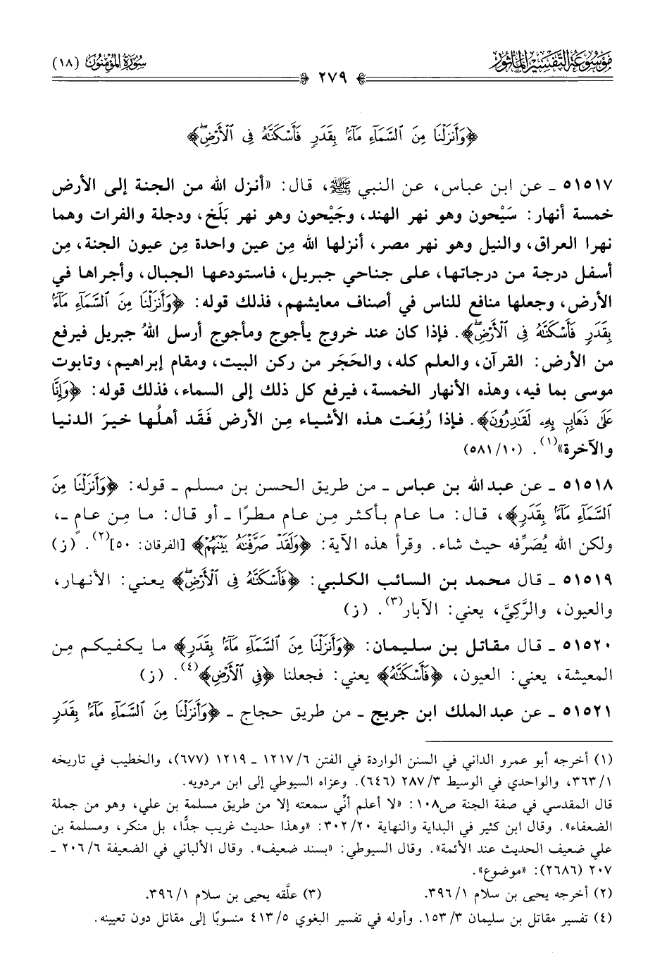 ٥١٥١٧ - عن ابن عباس، عن النبي - صلى الله عليه وسلم -، قال: «أنزل الله من الجنة إلى الأرض خمسة أنهار: سَيْحون وهو نهر الهند، وجَيْحون وهو نهر بَلَخ، ودجلة والفرات وهما نهرا العراق، والنيل وهو نهر مصر، أنزلها الله مِن عين واحدة مِن عيون الجنة، مِن أسفل درجة من درجاتها، على جناحي جبريل، فاستودعها الجبال، وأجراها في الأرض، وجعلها منافع للناس في أصناف معايشهم، فذلك قوله: {وأنزلنا من السماء ماء بقدر فأسكناه في الأرض}. فإذا كان عند خروج يأجوج ومأجوج أرسل اللهُ جبريل فيرفع من الأرض: القرآن، والعلم كله، والحَجَر من ركن البيت، ومقام إبراهيم، وتابوت موسى بما فيه، وهذه الأنهار الخمسة، فيرفع كل ذلك إلى السماء، فذلك قوله: {وإنا على ذهاب به لقادرون}. فإذا رُفِعَت هذه الأشياء مِن الأرض فَقَد أهلُها خيرَ الدنيا والآخرة» (¬١). (١٠/ ٥٨١)