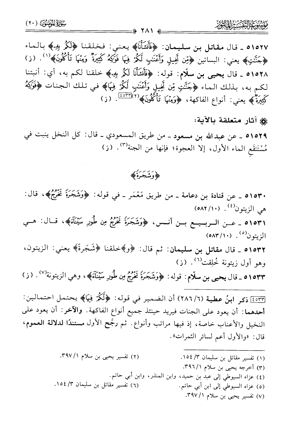 ٥١٥٣٢ - قال مقاتل بن سليمان: ثم قال: {و} خلقنا {شجرة} يعني: الزيتون، وهو أول زيتونة خُلِقت (¬٦). (ز)