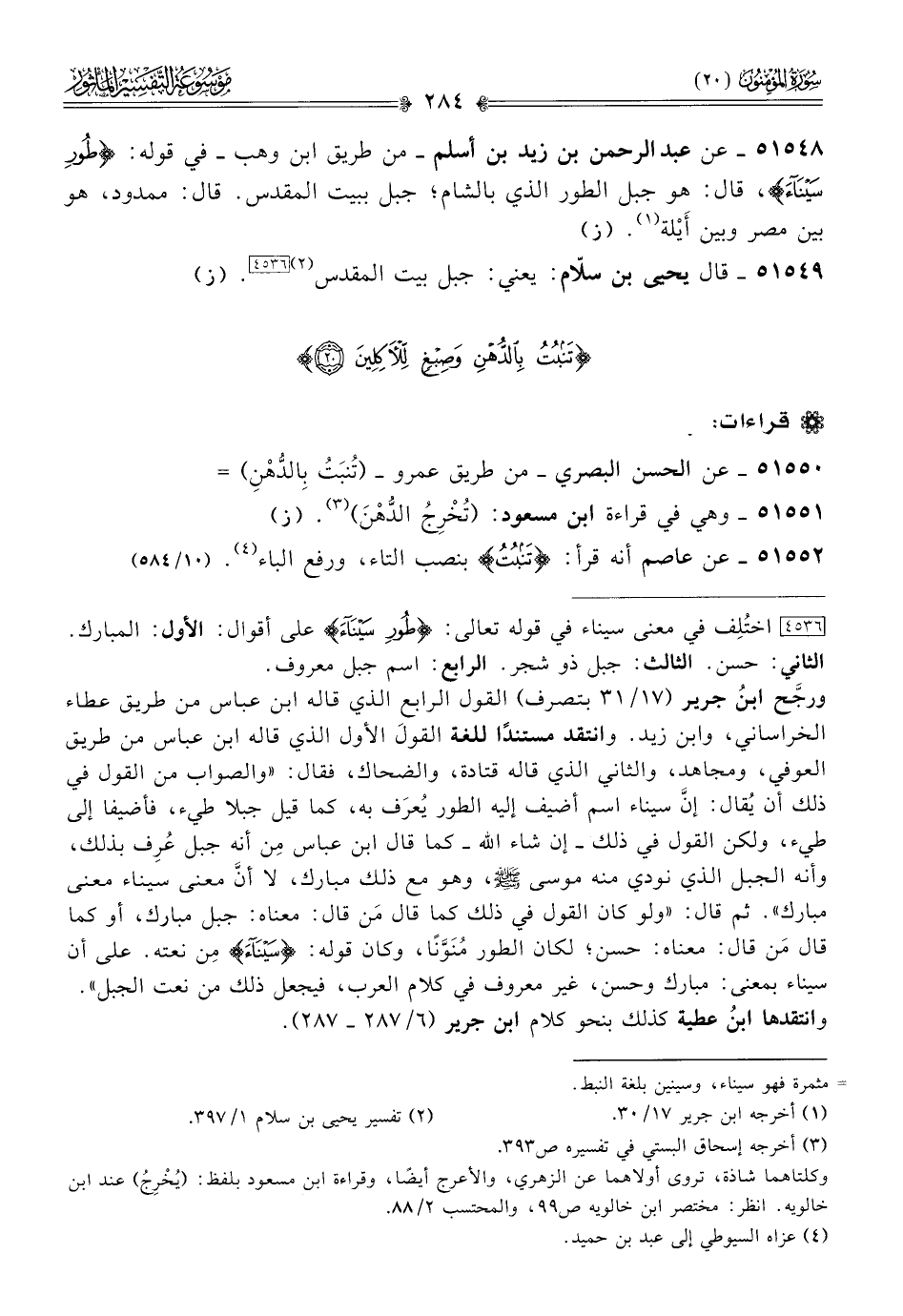 ٥١٥٤٨ - عن عبد الرحمن بن زيد بن أسلم -من طريق ابن وهب- في قوله: {طور سيناء}، قال: هو جبل الطور الذي بالشام؛ جبل ببيت المقدس. قال: ممدود، هو بين مصر وبين أيْلة (¬١). (ز)
