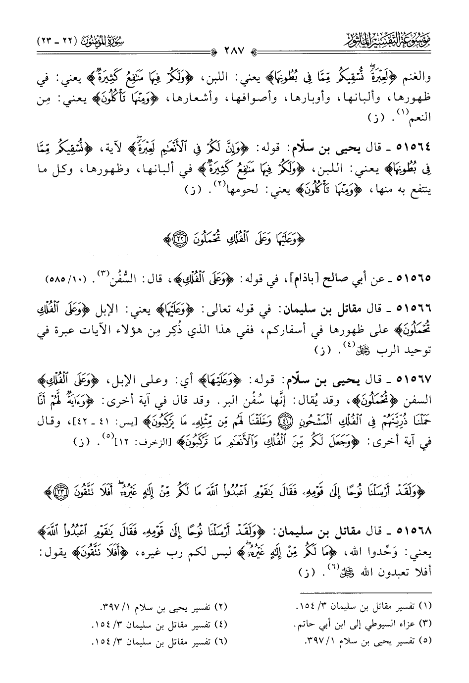 ٥١٥٦٤ - قال يحيى بن سلّام: قوله: {وإن لكم في الأنعام لعبرة} لآية، {نسقيكم مما في بطونها} يعني: اللبن، {ولكم فيها منافع كثيرة} في ألبانها، وظهورها، وكل ما ينتفع به منها، {ومنها تأكلون} يعني: لحومها (¬٢). (ز)