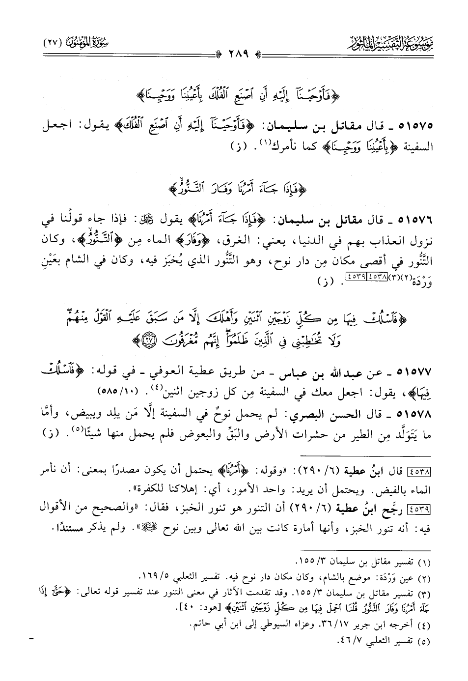 ٥١٥٧٦ - قال مقاتل بن سليمان: {فإذا جاء أمرنا} يقول - عز وجل -: فإذا جاء قولُنا في نزول العذاب بهم في الدنيا، يعني: الغرق، {وفار} الماء مِن {التنور}، وكان التَّنُّور في أقصى مكان مِن دار نوح، وهو التَّنُّور الذي يُخبَز فيه، وكان في الشام بعَيْنِ ورْدَة (¬٢) (¬٣) [٤٥٣٨] [٤٥٣٩]. (ز)