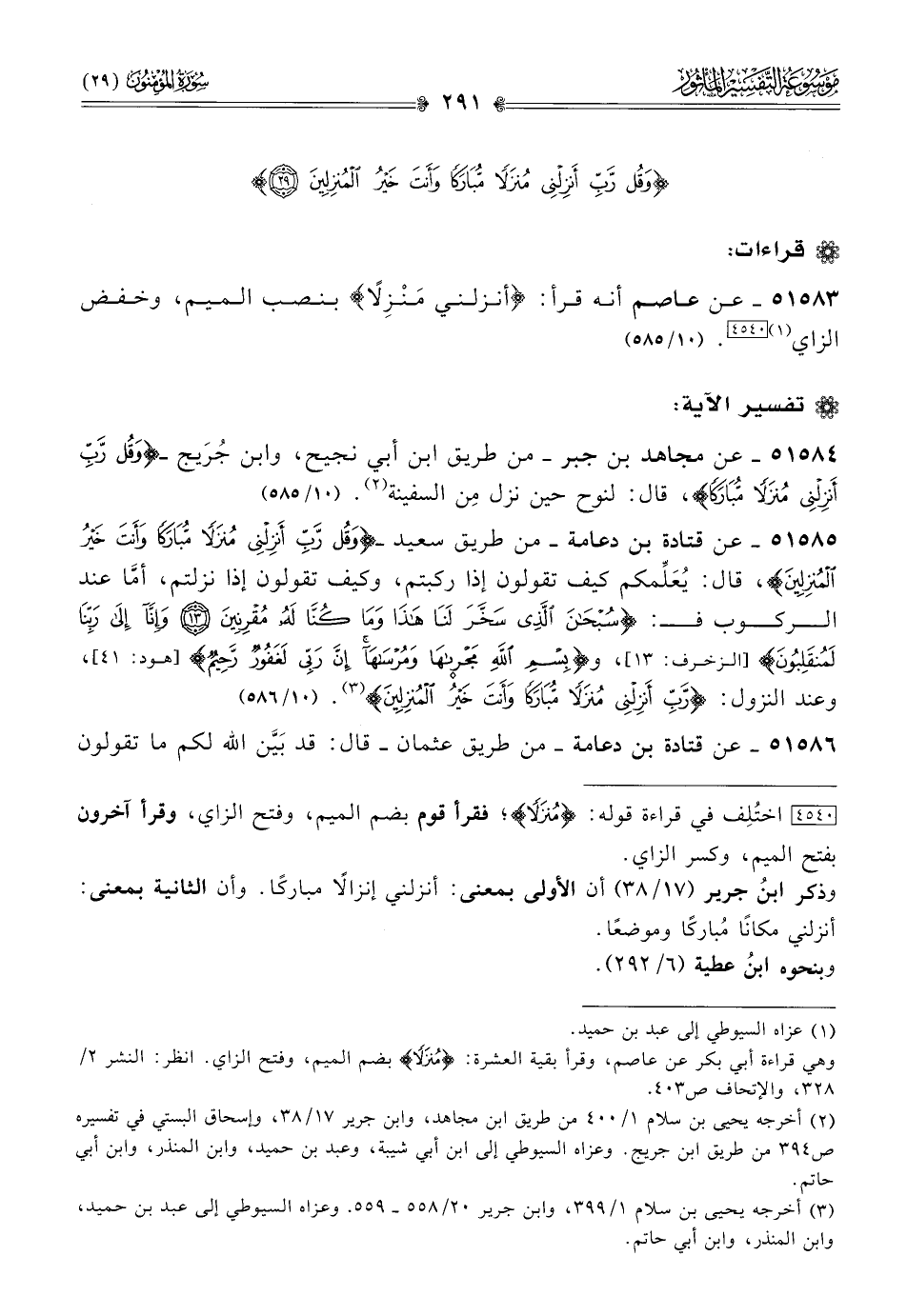 ٥١٥٨٥ - عن قتادة بن دعامة -من طريق سعيد- {وقل رب انزلني منزلا مباركا وأنت خير المنزلين}، قال: يُعَلِّمكم كيف تقولون إذا ركبتم، وكيف تقولون إذا نزلتم، أمّا عند الركوب فـ: {سبحان الذي سخر لنا هذا وما كنا له مقرنين وانا إلى ربنا لمنقلبون} [الزخرف: ١٣]، و {بسم الله مجراها ومرساها إن ربي لغفور رحيم} [هود: ٤١]، وعند النزول: {رب أنزلني منزلا مباركا وأنت خير المنزلين} (¬٣). (١٠/ ٥٨٦)