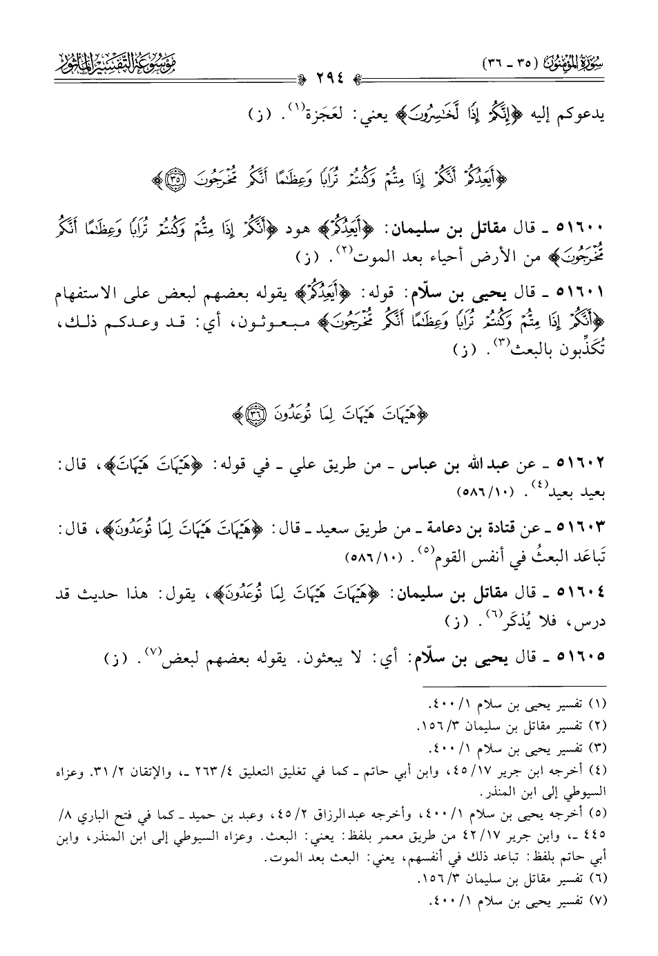 ٥١٦٠٥ - قال يحيى بن سلّام: أي: لا يبعثون. يقوله بعضهم لبعض (¬٧). (ز)